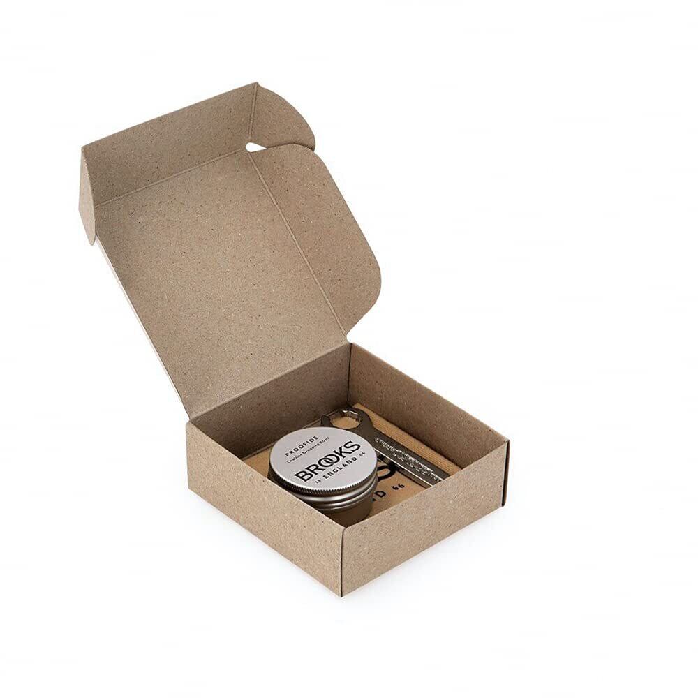 BROOKSレザーサドルのメンテナンスに最適なPROOFIDEに、テンション調整用のスパナと不織布1枚がセットになったサドルケアキット。