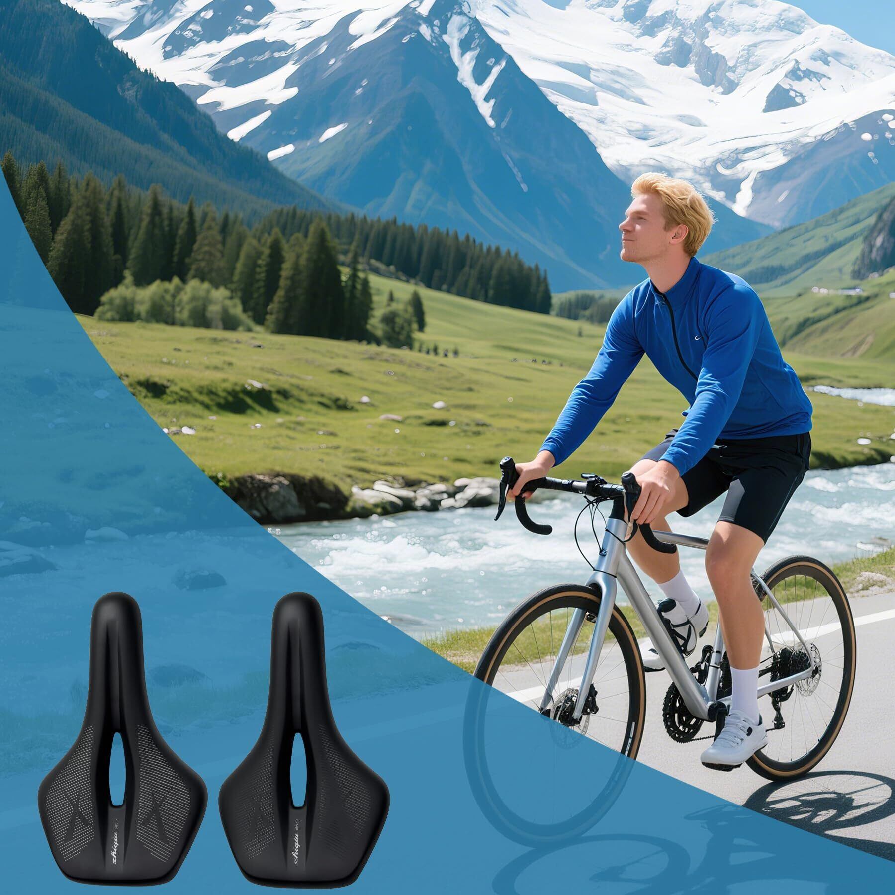 【中空デザイン】穴あきデザインが採用され、自転車サドルの真ん中の空気循環を促して通気性が抜群です。走行中汗をかいても蒸れにくくロングライドの快適さを実現します。中空デザインのおかげで、股間への圧力を軽減し、尿道、前立腺への圧迫もしっかりと減らします。ライド後の痺れや痛みを緩和する効果もあります。