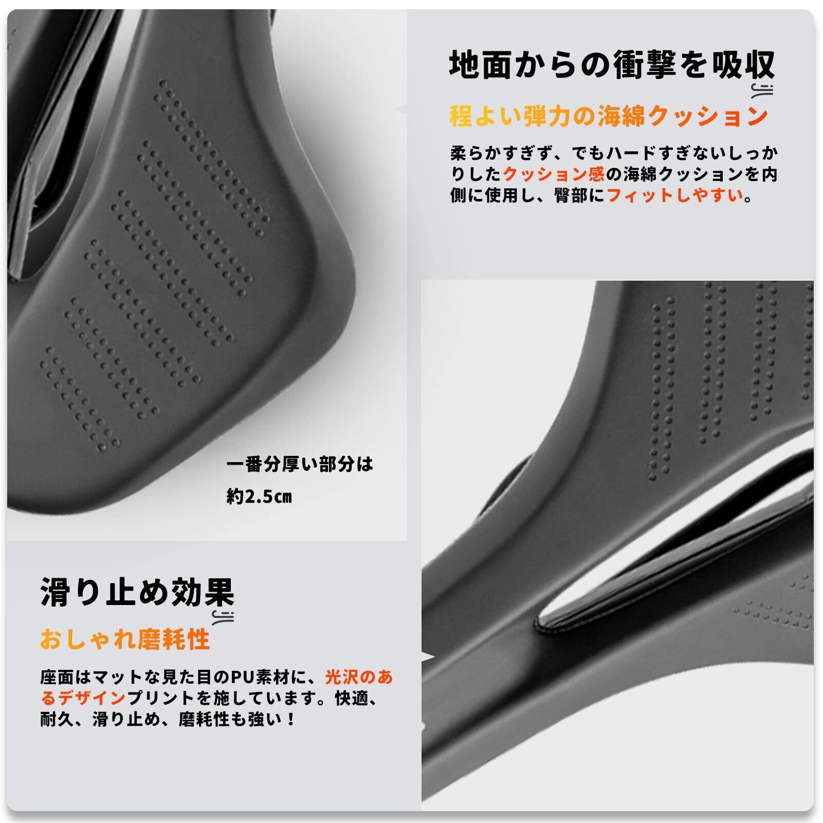 【地面からの衝撃を吸収】幅広でラウンド形状な座面で、安定して長く座れる柔らかい低反発タイプのサドルです。自転車サドルは固すぎず、柔らかすぎないクッション性のしっかりした高密度海綿クッション素材をインナーに採用します。身体の重量や衝撃を和らげてお尻の痛みを軽減してくれます。