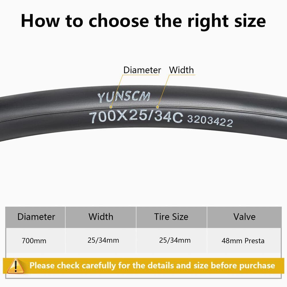 【700x25c-34c 自転車チューブ 肉厚】:700x25c/28c/30c/32c/34cの自転車に適用、仏式バルブ48mm,高リムの最良選択。ロードバイク、クロスバイクに適しています。注意:購入前にタイヤのサイズをチェックしてください。タイヤサイズは通常外タイヤの側面に表示されます。