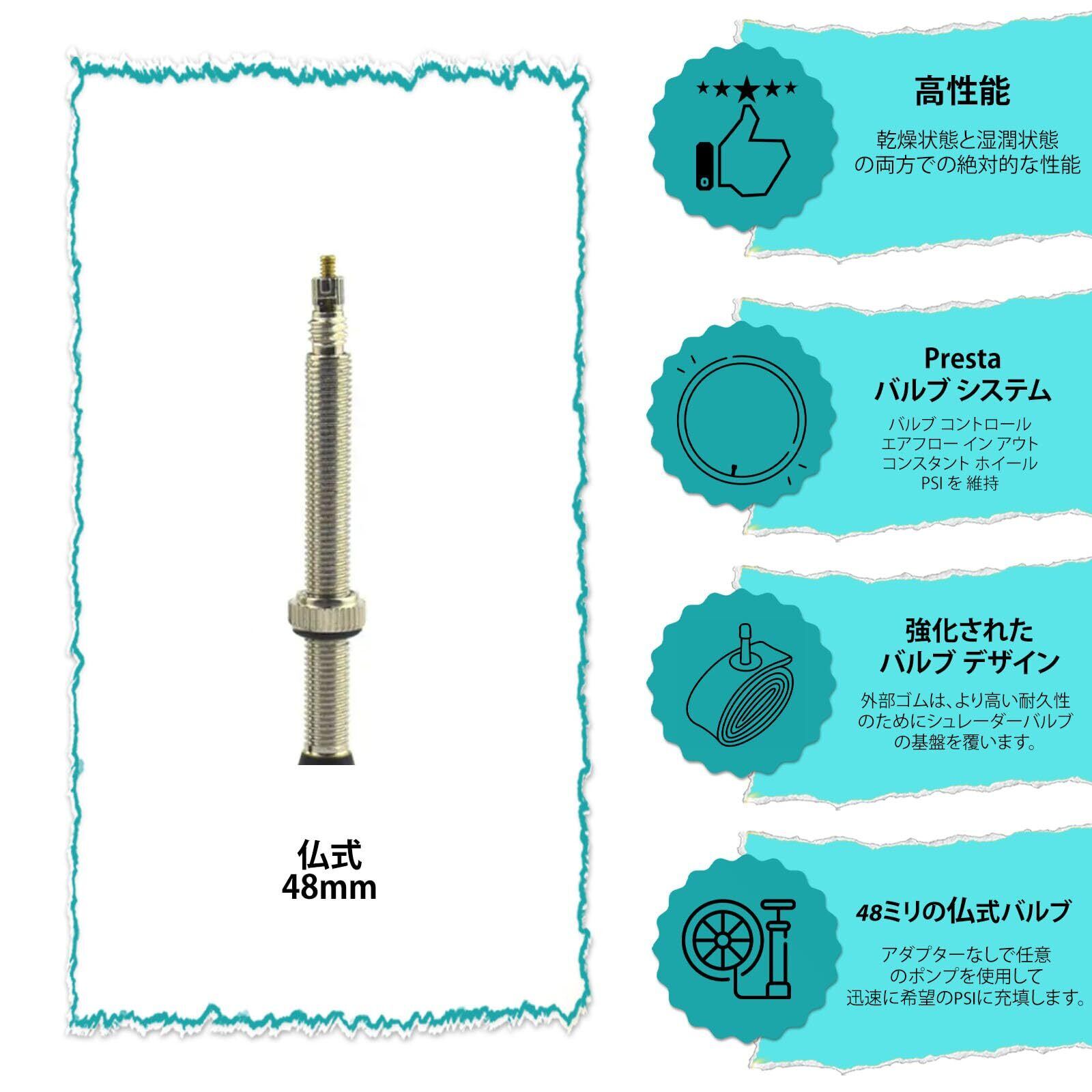 【バルブの種類】仏式バルブ(プレスタバルブ)48mm。仏式バルブは、ロードバイク、グラベルロードバイク、クロスバイク、競技用自転車などに広く使用されています。