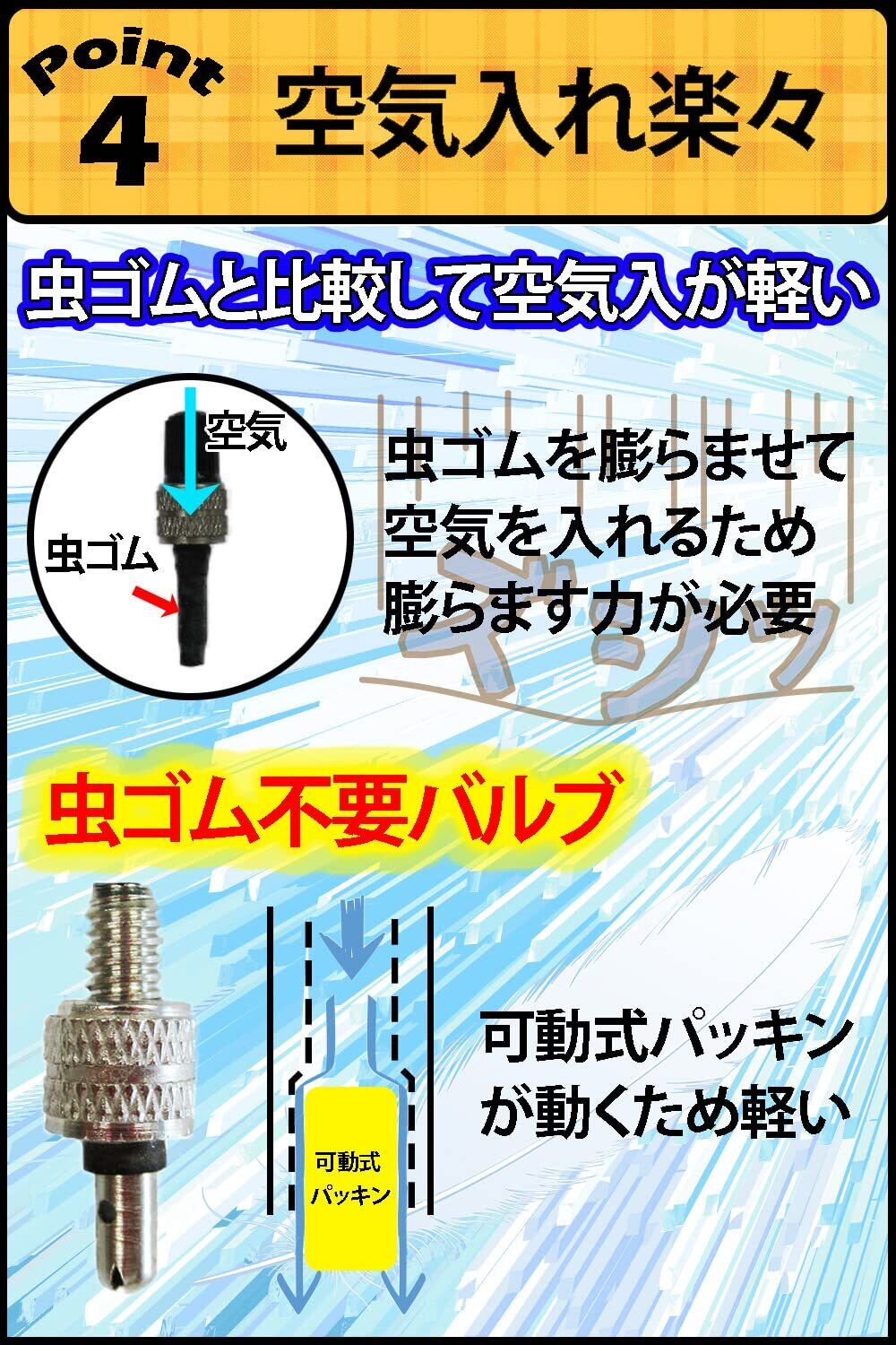 【空気入れが楽】バルブ内部のパッキンが動くため、空気入れに力が要らず、楽に空気入れができます。