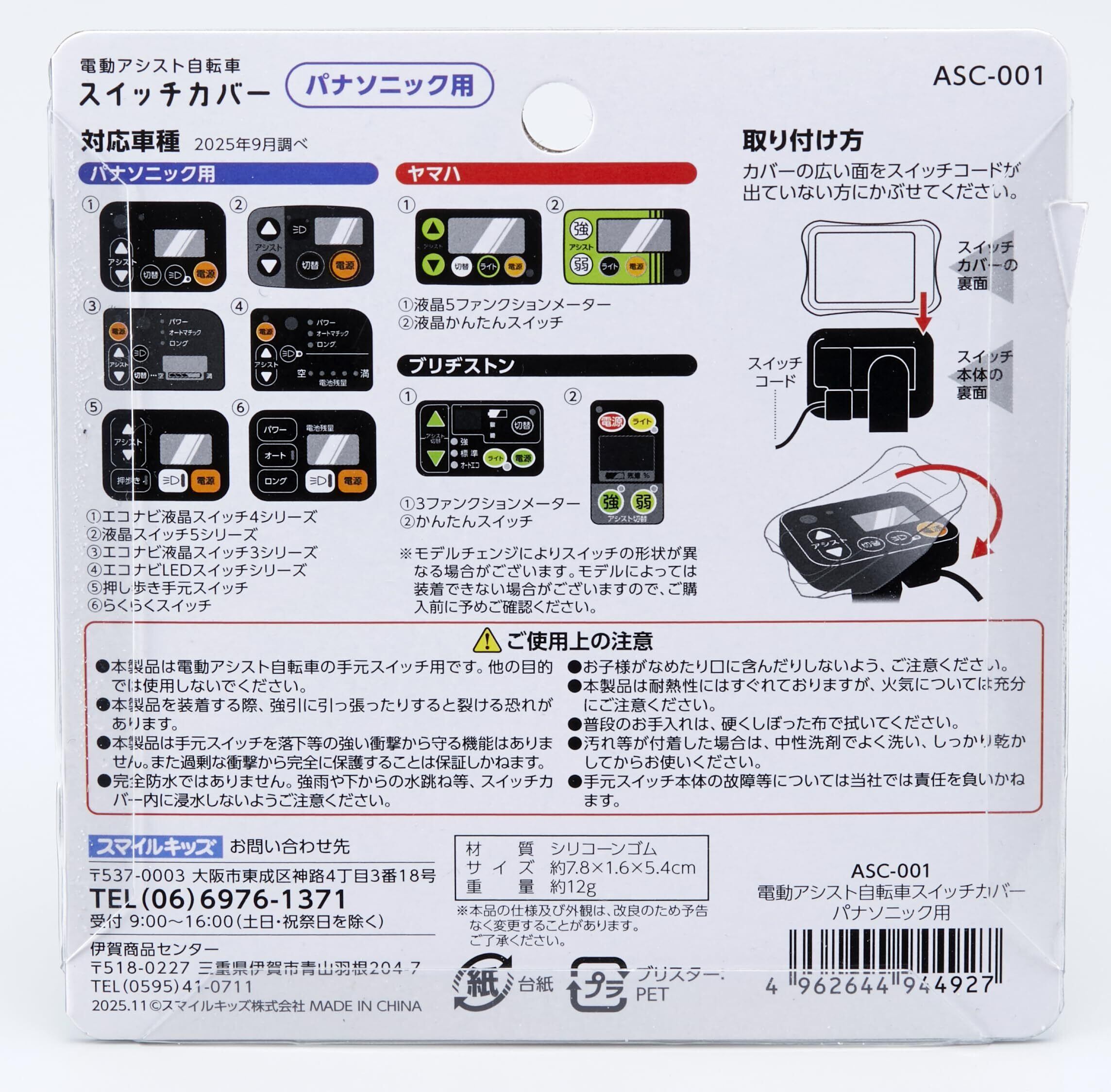 シリコン製の為、多少の大きさのスイッチにも対応し一部、ヤマハ、ブリジストンの機種にも対応可能です。 パナソニックの機種も、一部対応出来ない機種もありますので、詳細はパッケージ裏面に記載の内容をご確認ください。 パナソニック:エコナビ液晶スイッチ4、液晶スイッチ5、エコナビ液晶スイッチ3、エコナビLEDスイッチ、押し歩き手元スイッチ、らくらくスイッチ ヤマハ:液晶5ファンクションメーター、液晶かんたんスイッチ ブリジストン:3ファンクションメーター、かんたんスイッチ