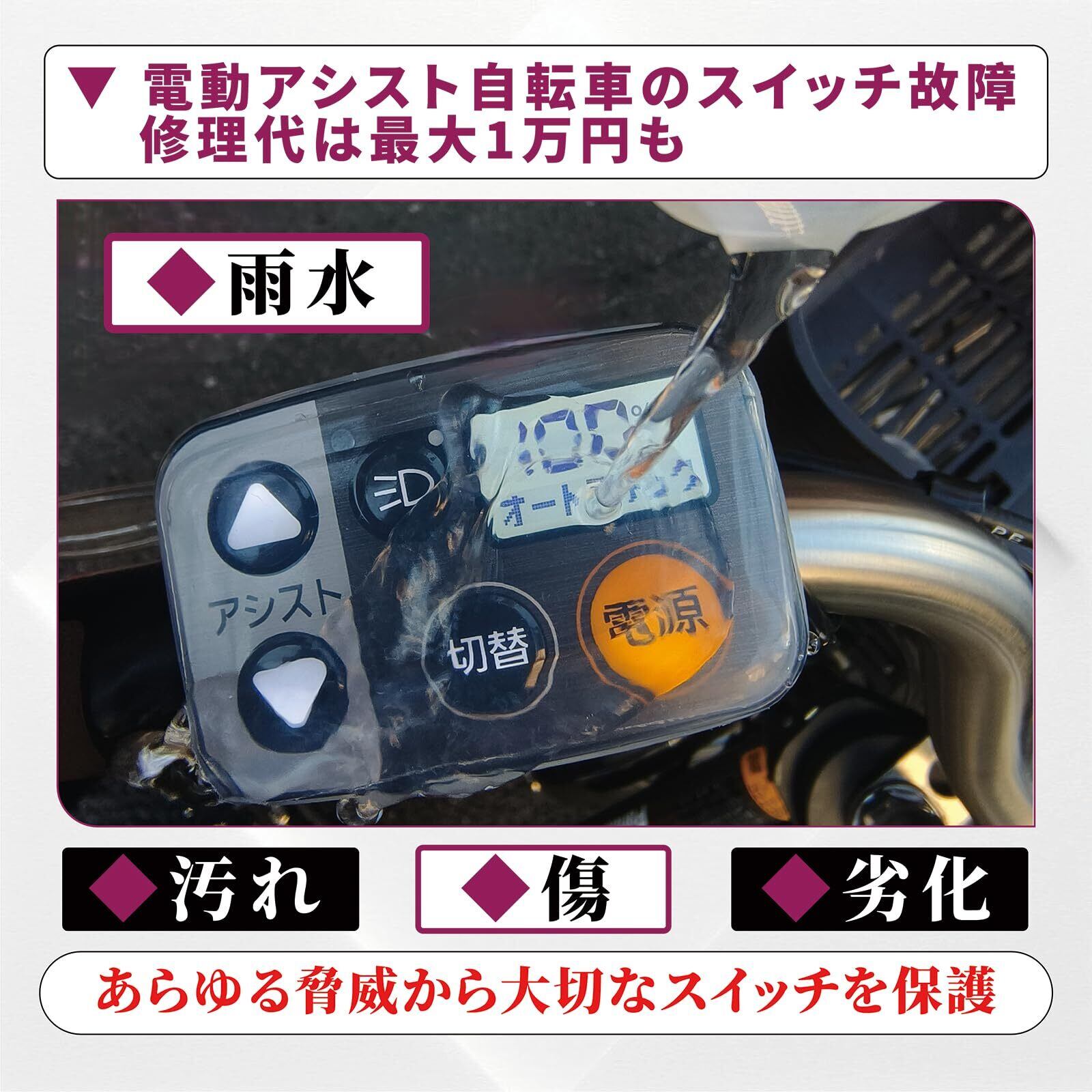 【安心保護】電動自転車スイッチカバーで汚れやキズ、破損や劣化から守って快適な毎日を!雨や汚れ、傷、紫外線による劣化からスイッチをしっかり保護。 壊れる前に守ることで、スイッチパネルの交換コストを節約できます。 雨がスイッチ内に侵入して故障し、修理に数万円かかるケースもあるため、事前の保護が安心です。