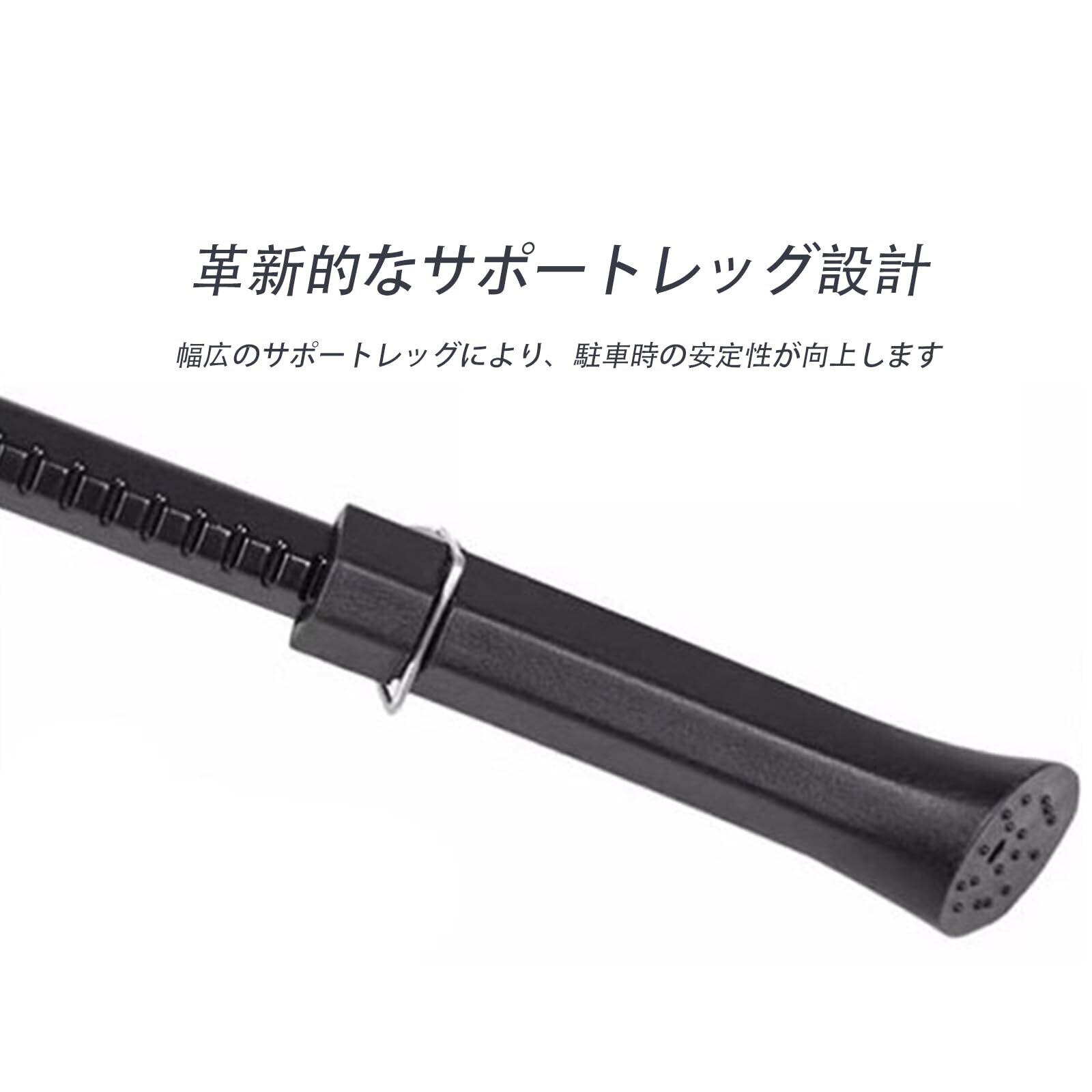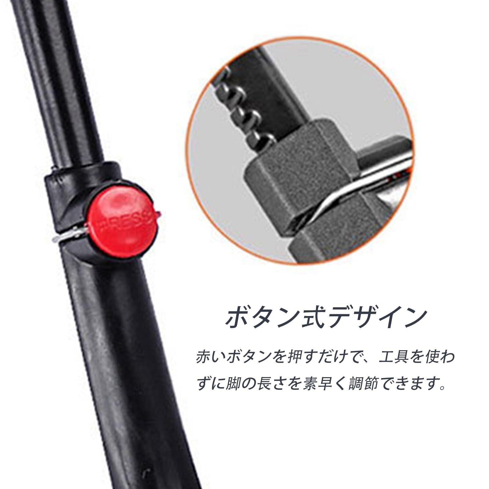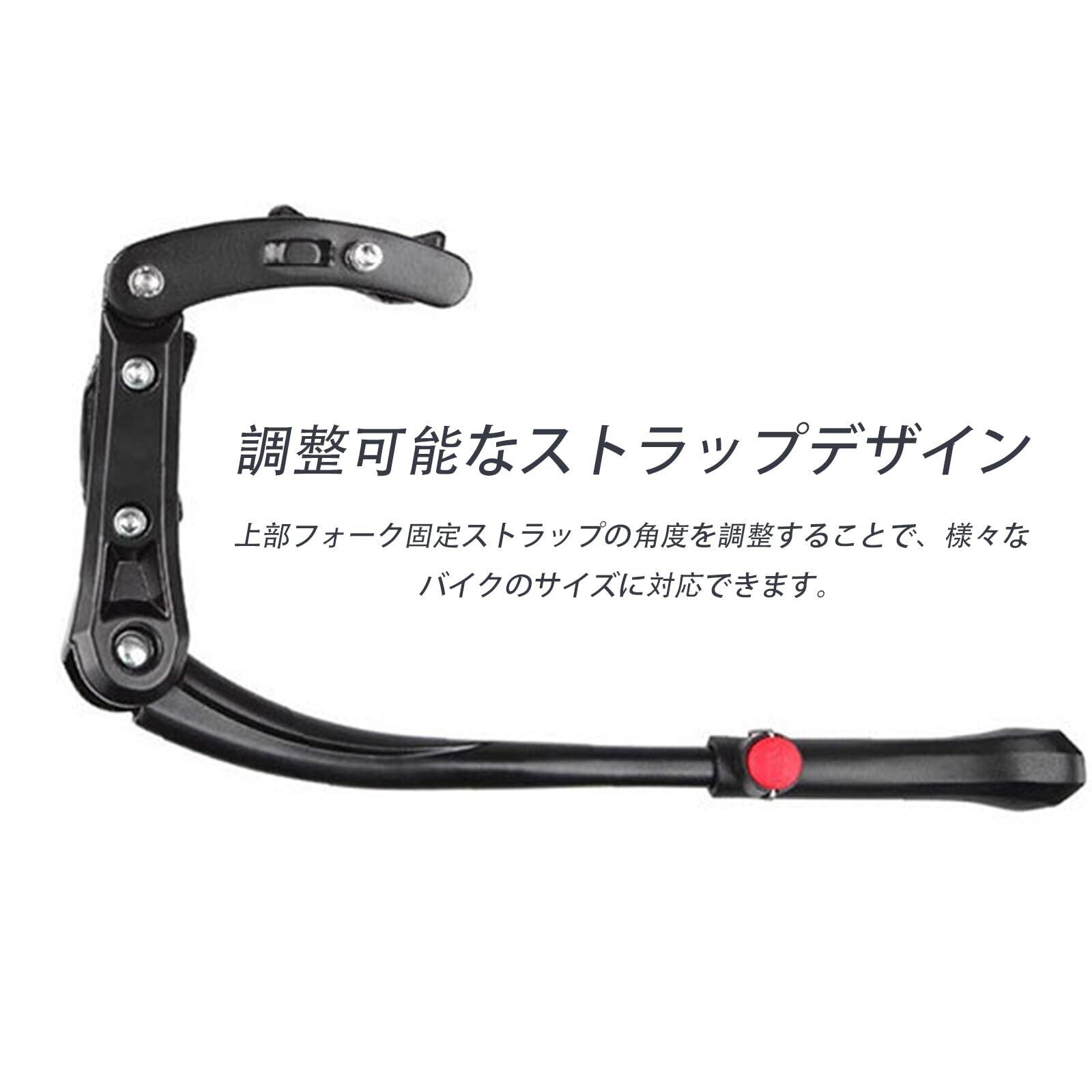 【調節可能】2点式の固定設計で、より強固で耐久性があり、赤色ボタンのワンボタンを押して支持脚の長さを調節し、 使用シーンや自転車に合わせて、スタンドの長さを調整可能。しっかり自転車を支えます。