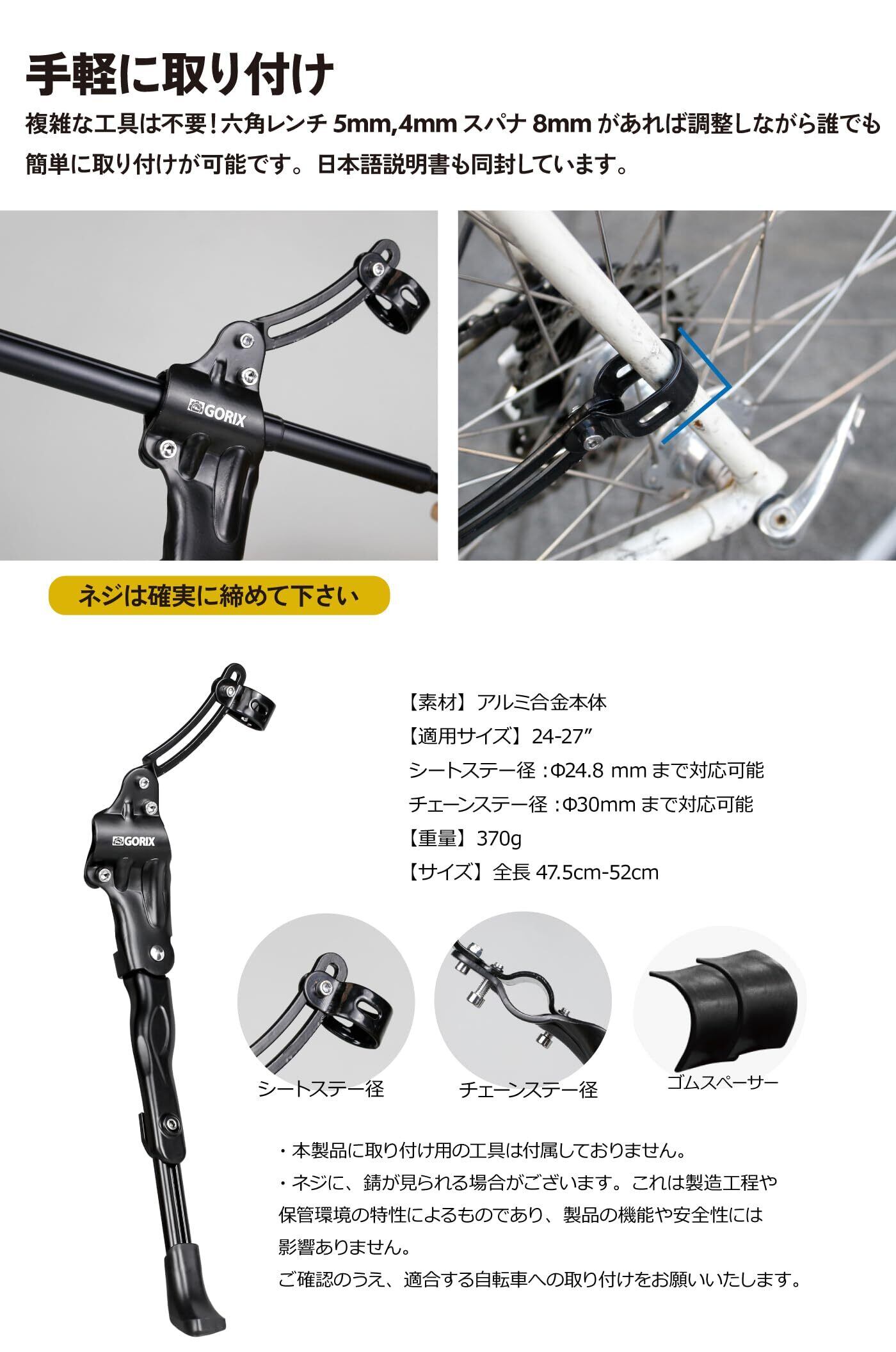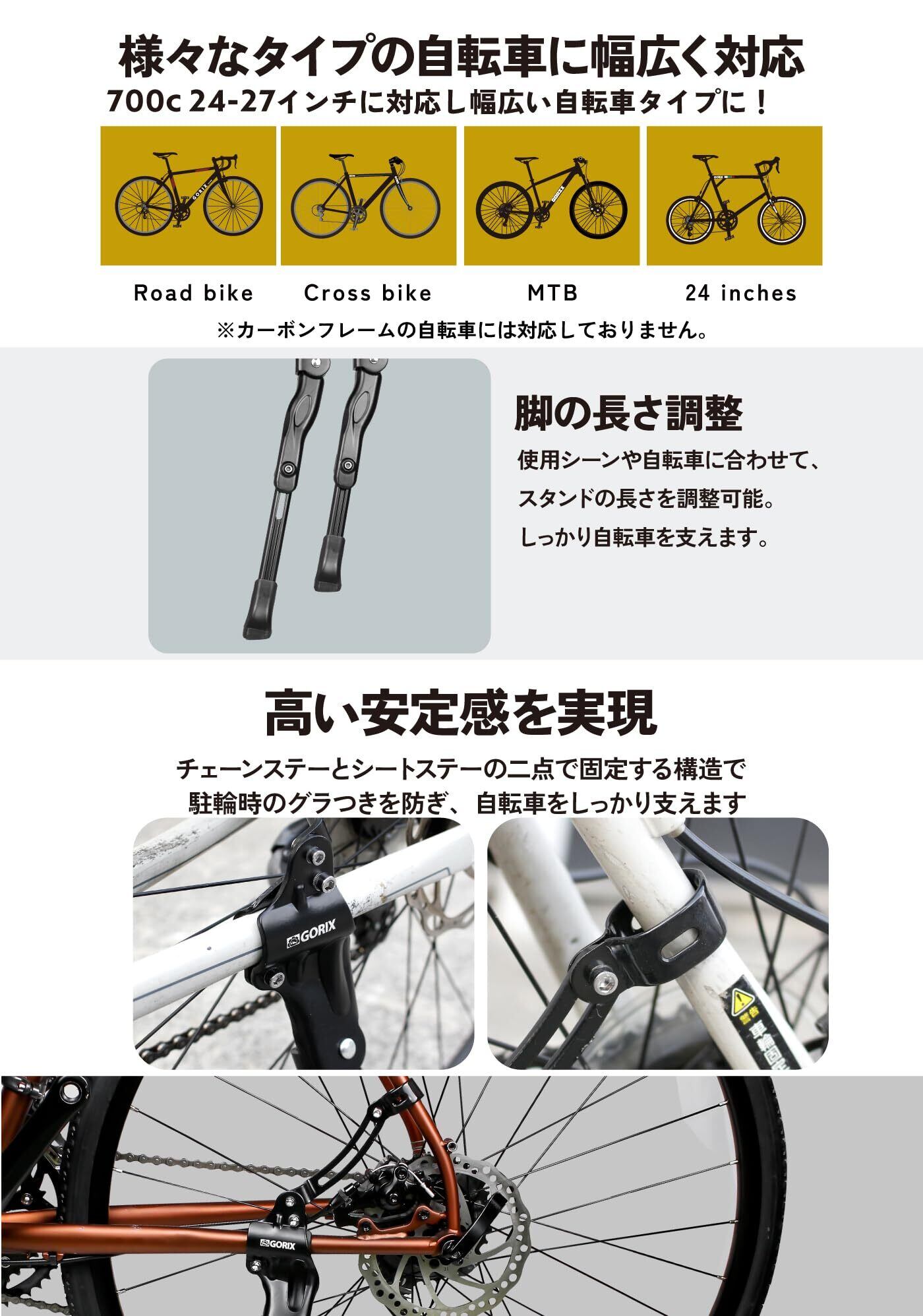 GORIX(ゴリックス) キックスタンド 自転車 スタンド 自転車スタンド 安定性 24-27インチ 調整 後つけ 軽量 取付け (GX-ST113) サイドスタンド クロスバイク ロードバイク mtb他