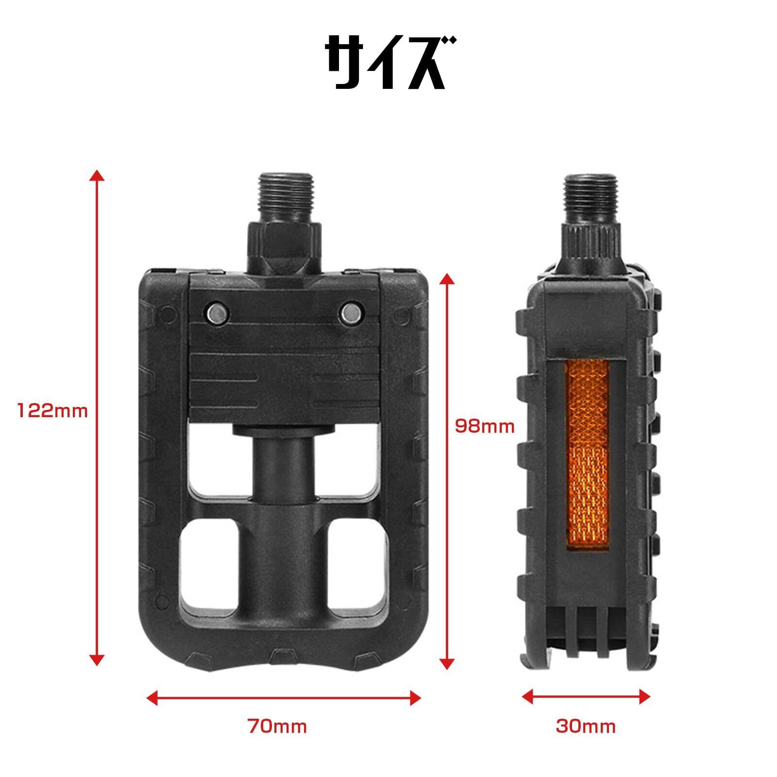 【サイズ・仕様】【サイズ】全長122mm、幅70mm、厚さ30mm【重さ】約330g(左右セット)【材質】プラスチック、金属【特徴】折りたたみ機能付き、反射板付き【対応ネジ径】14mm【セット内容】左右セット(ブラック)
