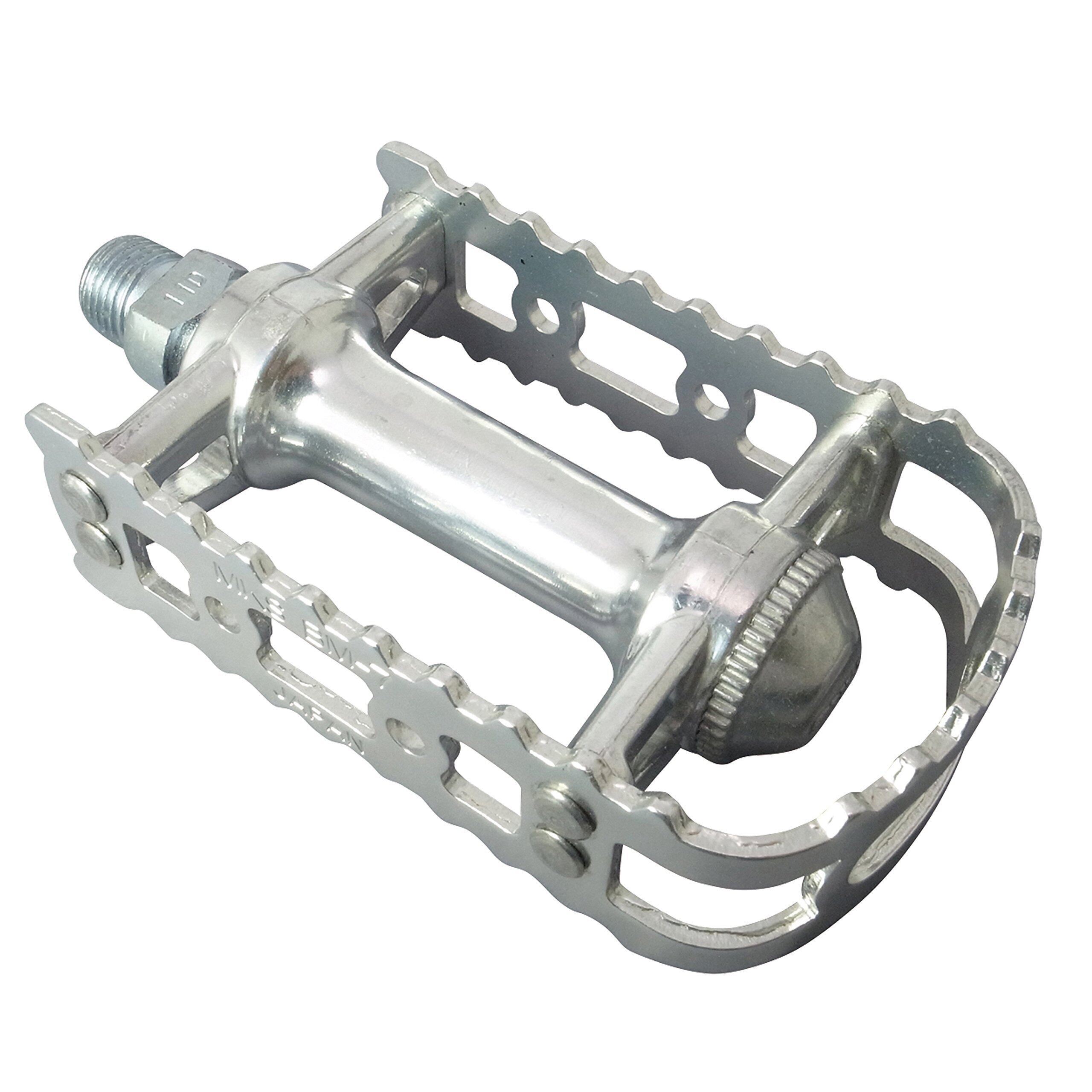原産国:日本 材質:アルミ 製品サイズ:踏面 98×61mm、重量:366g(ペア) ペダル軸サイズ:9/16 アルミ製ボディ/両面ペダル。左右セット カップ&コーンベアリング カラー:シルバー 前後リフレクター装備可能モデル ※リフレクターは別途お求めください トゥクリップ装着可能モデル。リフレクターと同時装着をする際はリフレクターのネジを利用し共締めとしてください