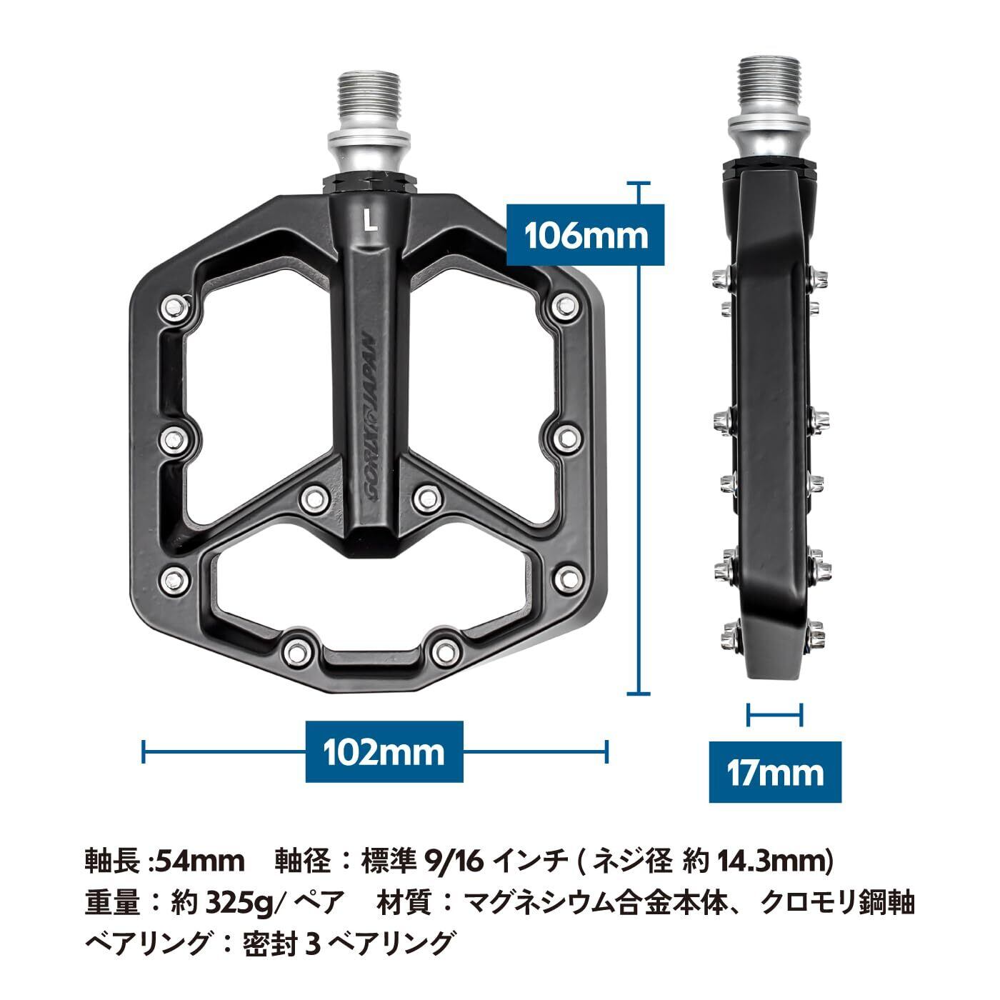 【商品内容】:ペダル左右セット【サイズ】:長さ102x幅106x厚み17mm、軸長54mm【軸径】:標準9/16インチ(ネジ径 約14.3mm)【重量】:約325g/ペア【材質】:マグネシウム合金本体、クロモリ鋼軸【ベアリング】:密封3ベアリング