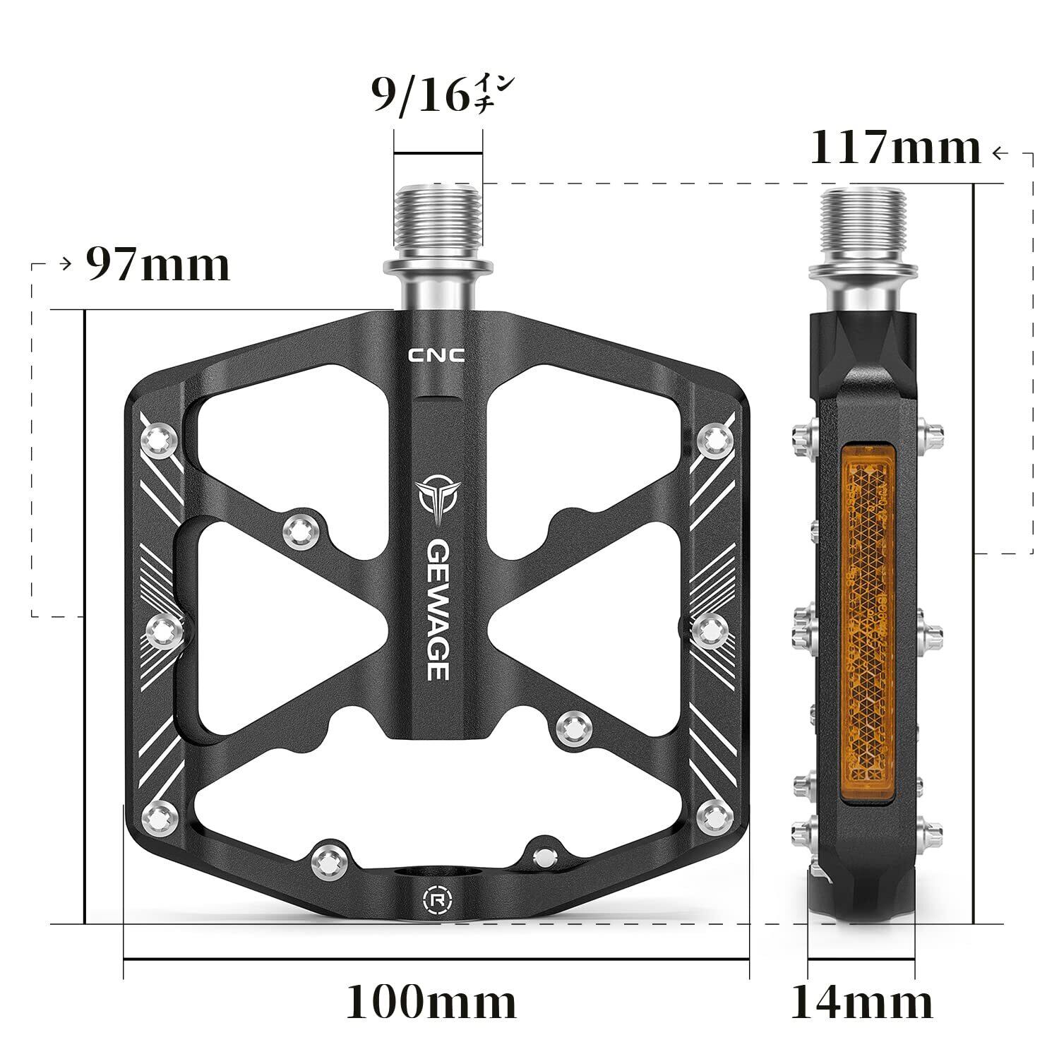 GEWAGE 自転車 ペダル 反射板付 フラットペダル シールドベアリング3入り アルミ製