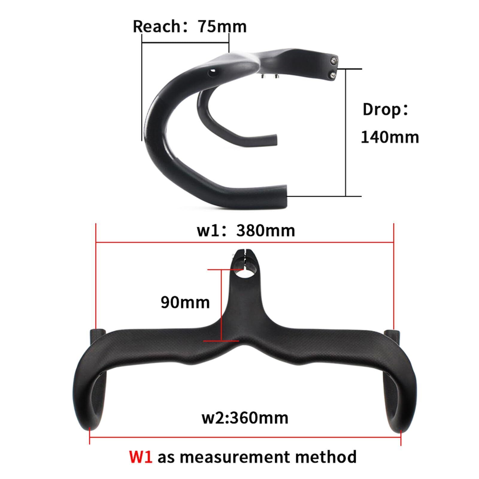一体型ハンドルバー素材: カーボンファイバー、カーボンロードバイクハンドルバー超軽量で耐久性。外観: 3K 光沢/3K マット、カラー: ブラック/レッド、ハンドルバー幅: 380/400/420/440 mm、ステム長: 90/100/110/120 mm、フォーク直径: 28.6 mm (1-1/8 インチ) : 140mm、リーチ: 75mm。