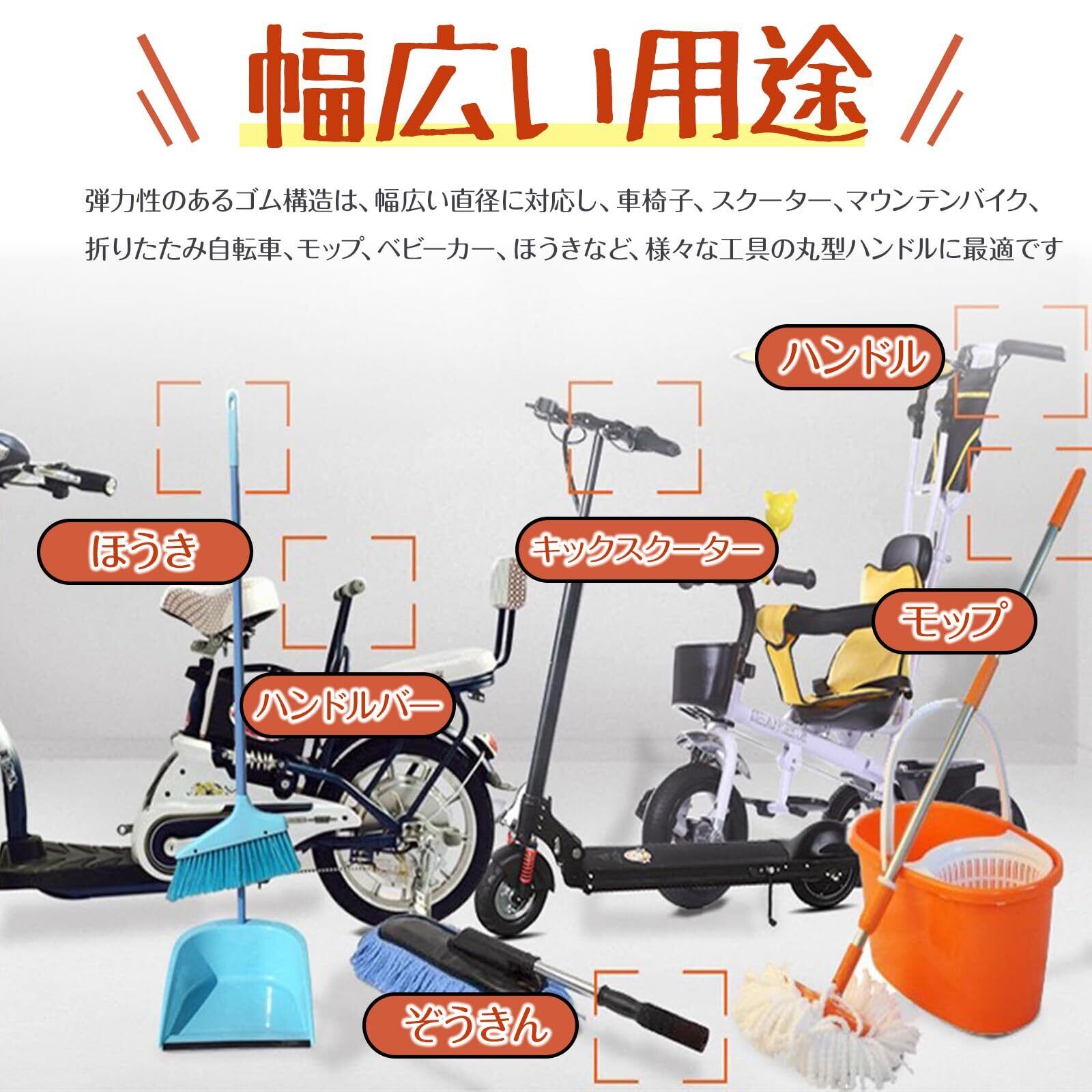 【適用範囲が広い】弾力性のあるゴム構造は、幅広い直径に対応し、車椅子、スクーター、マウンテンバイク、折りたたみ自転車、モップ、ベビーカー、ほうきなど、様々な工具の丸型ハンドルに最適です。複雑な測定は不要で、手で簡単に取り付けることができます。1セットで、家庭、旅行、掃除など、さまざまなシーンのニーズに対応できます。※ご購入前に、自転車ハンドルグリップ の直径の確認をお願いします。