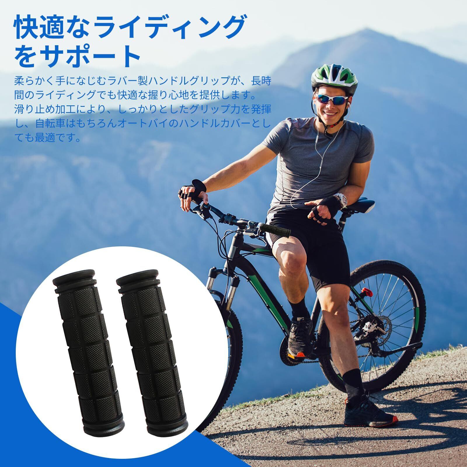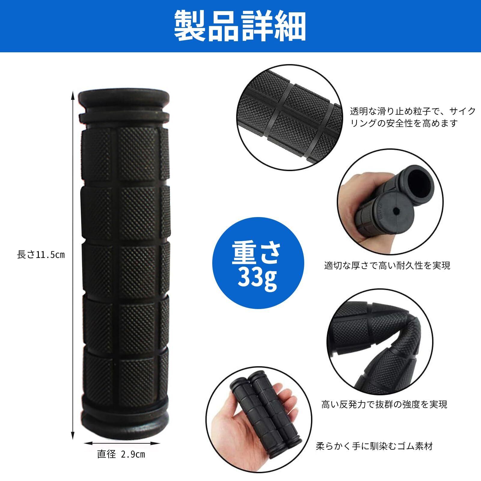 【商品内容】:自転車グリップ 2個セット(1組) サイズ:長さ11.5cm × 外径2.9cm × 内径2.2cm 重量:67g(1組) 材質:ゴム カラー:ブラック ※ご購入前に、お使いの自転車のハンドルバー直径をご確認ください。