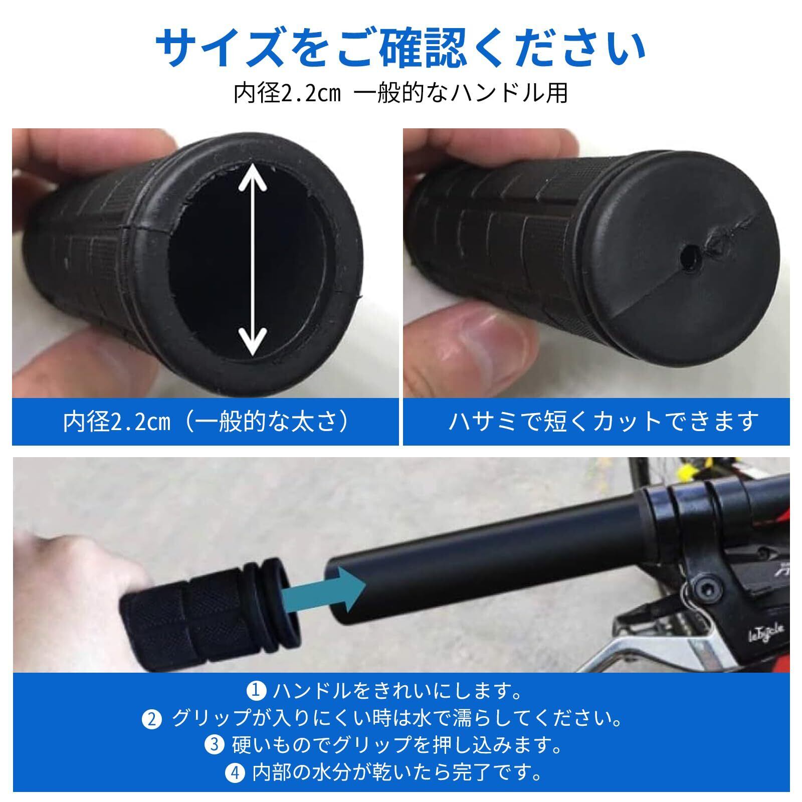 工具は一切不要。グリップをハンドルバーに差し込み、締め付けるだけで簡単に取り付け可能です。22.2mmの標準内径ハンドルバーに対応し、しっかりと固定される設計のため、走行中に緩んだり外れたりする心配もなく、安心してお使いいただけます。