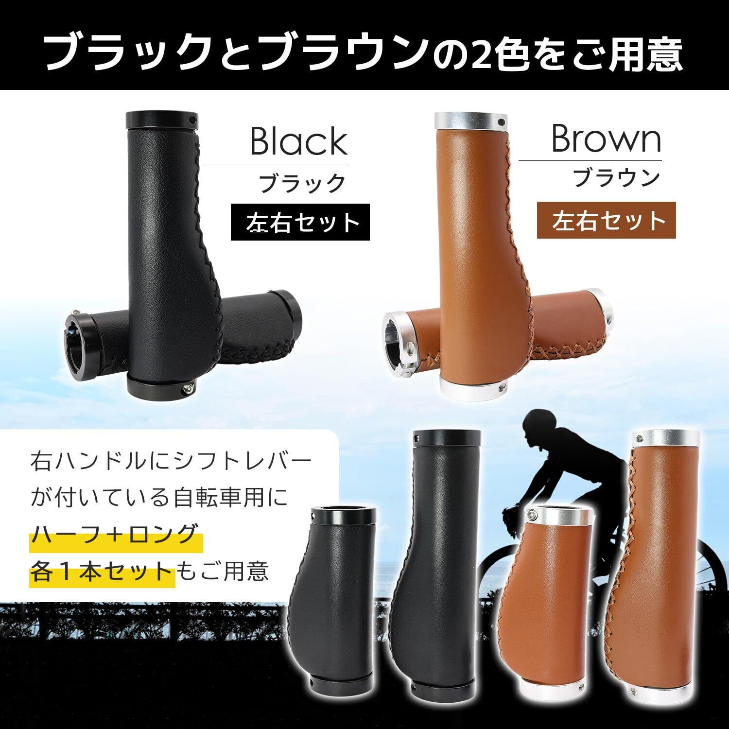 【サイズ・カラー】ロングサイズ2本セットと右ハンドルにシフトレバーが付いている自転車用に片側ハーフ(ショート)サイズをご用意!カラーは高級感のあるブラック(黒)とオシャレさを演出するブラウン(茶)の2色から愛車に合わせてお選びください。