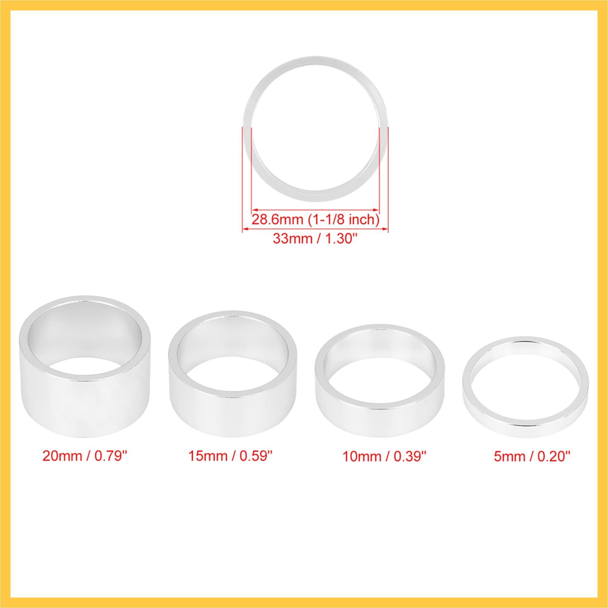 【寸法】内径:28.6mmのヘッド、ステアラーチューブに適合します。外径:33 mm、厚さ:5mm(1個)、10mm(1個)、15mm(1個)、20mm(1個)。
