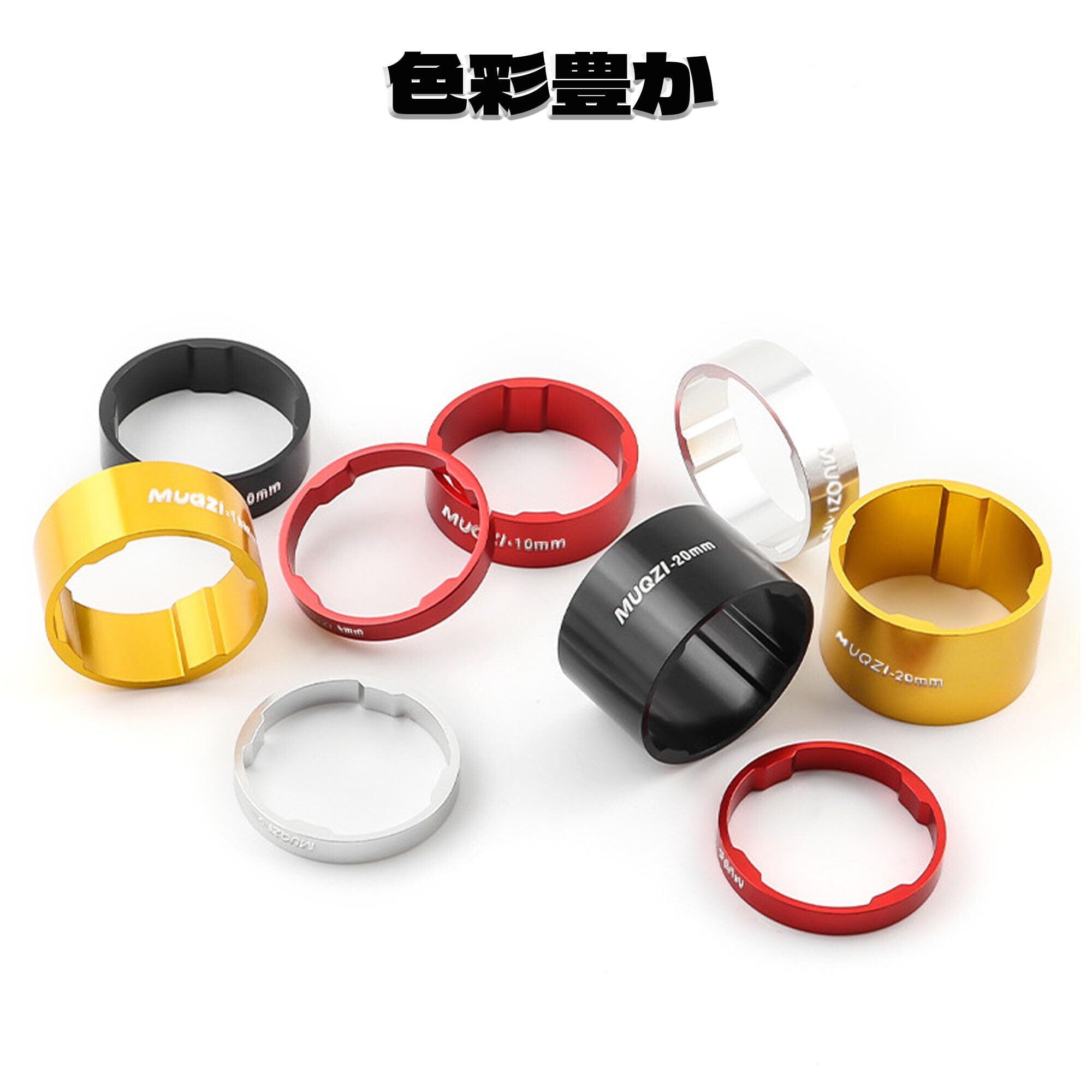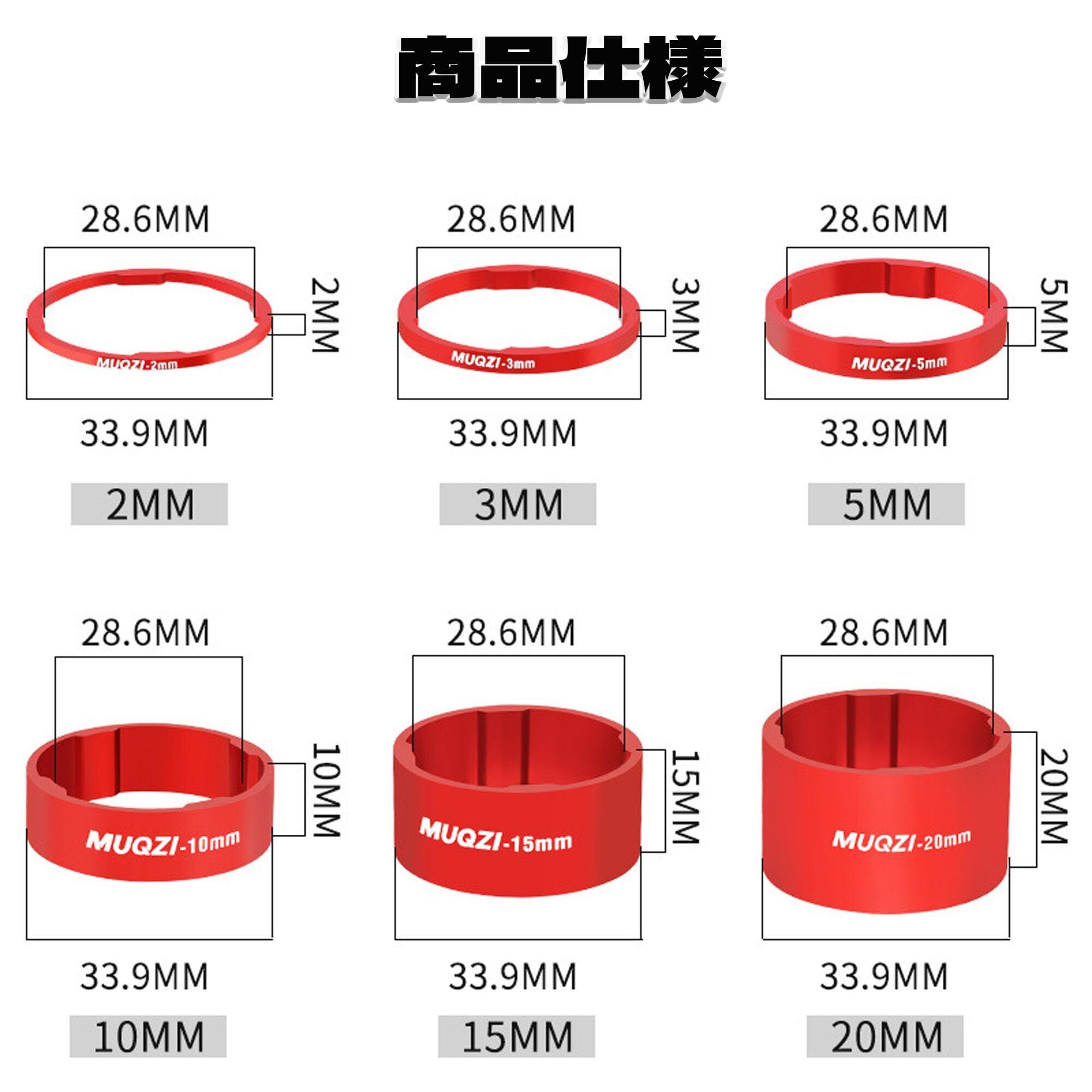 【商品仕様】ヘッドセットスペーサー6個が含まれます。サイズ:内径28.6mm/外径33.9mm、高さ:2/3/5/10/15/20mm、28.6mmのフォークシートポストに対応。(ブラック/レッド/イエロー/シルバー)