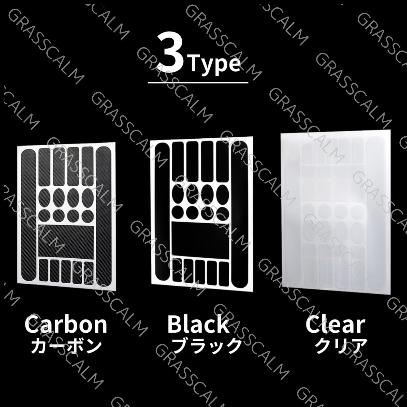 【高品質PVC採用・3色展開】色褪せや黄ばみが起こりにくい耐久素材を使用。カーボン調/艶消しブラック/クリアの3種から選べます。