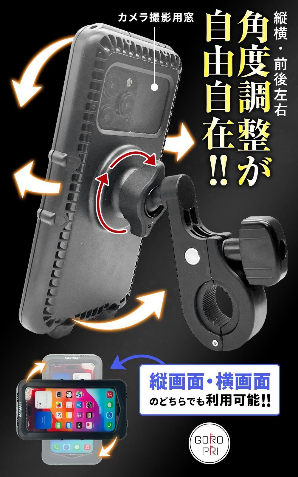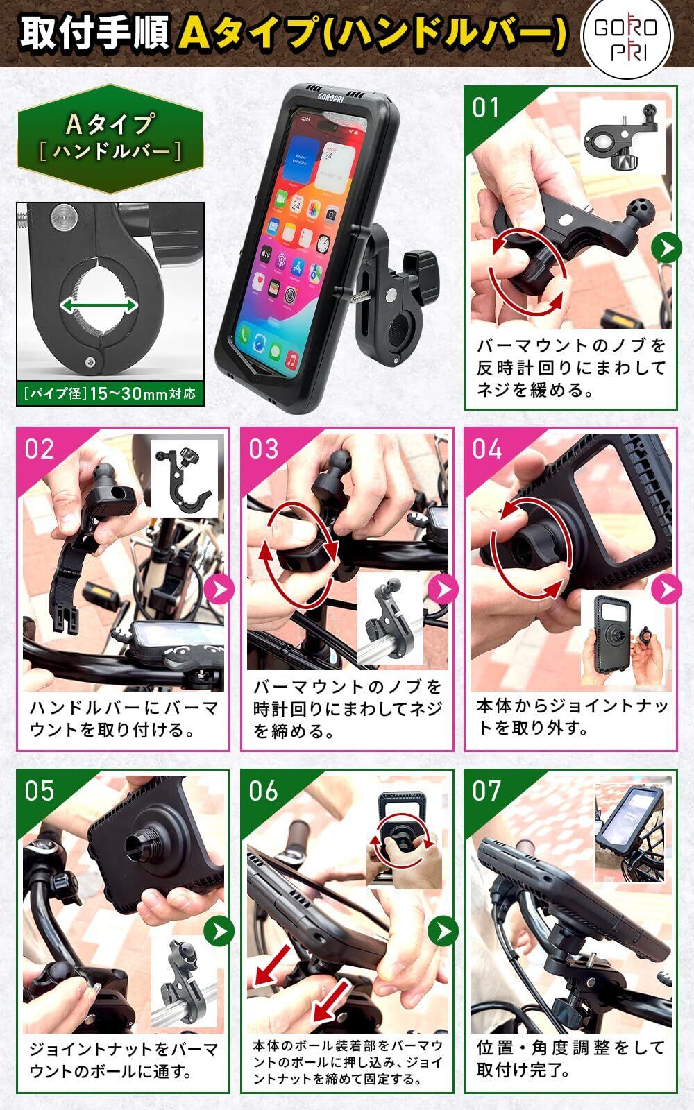 【対応サイズ】本製品は4~7インチまでの幅広いスマホサイズに対応しております。[内寸]縦:約169㎜ 横:約83㎜ 厚さ:約11㎜、厚さについてはシンプルなデザインのスマホケースには対応しておりますが、スマホリングや手帳型ケースには対応しておりません。場合によってはスマホケースを外してご利用ください。【取付方法】Aタイプは自転車やバイクのハンドルバーやクランプバー(パイプ径:15~30㎜対応)、クランプ方式なので着脱が簡単なため、複数台で共有することもできます。Bタイプはバイクや原付のバイクミラー(M10ネジ)に取り付けることができます。※バイクミラーの根本の形状によっては、取付けにスペーサー(ミラーアダプター)を併用する必要があります。お手持ちの車種に応じてご自身で別途ご用意ください。詳細は商品ページ・説明書を参照して下さい。