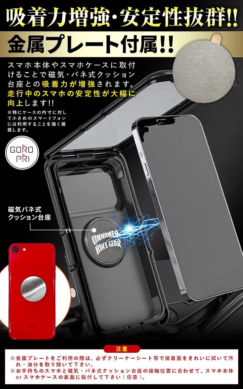 【吸着力増強金属プレート付属‼】付属の金属プレートをスマホ本体やスマホケースの裏面、磁気・バネ式クッション台座との接触面に取付けることで、スマホ(ケース)と台座との吸着力が大幅に増強されます。走行中のスマホの安定性が大幅に向上します‼走行中の振動でケースの中でスマホが揺れたり、移動したりすることはありません。