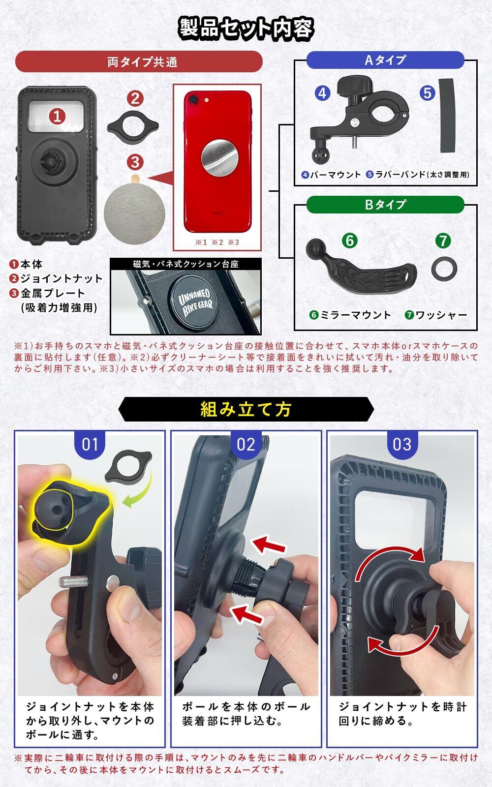 【注意】※Bタイプ(バイクミラー用)は車種によっては取付けにスペーサー(ミラーアダプター)を併用する必要があります。詳細は商品ページ・説明書を参照して下さい。※本製品はIPX6のため豪雨環境でも使用可能ですが、水没させるような用途に使用しないで下さい。※法令を遵守し安全運転を心掛けて下さい。。※特にケースの内寸に対して小さめのスマートフォンには付属の金属プレートを利用することを強く推奨します。※金属プレートを貼付する前に、必ずクリーナーシート等で接着面をきれいに拭いて汚れ・油分を取り除いて下さい。※製造ロットにより部品のデザインが少し異なる場合があります。※ 所定の寸法範囲内であっても、機種の形状や仕様、ご使用になる保護ケースなどによっては収納できない場合があります。お客様の実機にて事前に十分ご確認ください。※使用前に商品の状態をご確認下さい。不良品に関しましては返金または代替品で対応いたします。本商品を使用しての落下等の機器破損、二次的損害等の賠償責任の全てに関しましては、当店では一切行いませんので予めご了承ください。