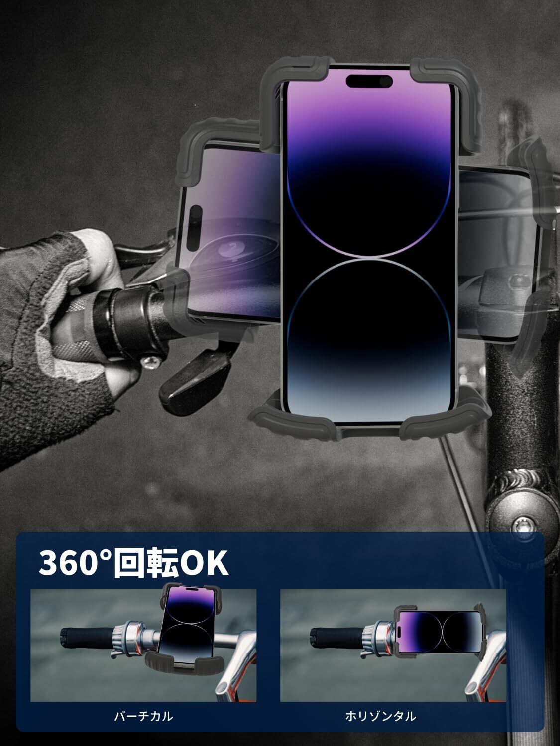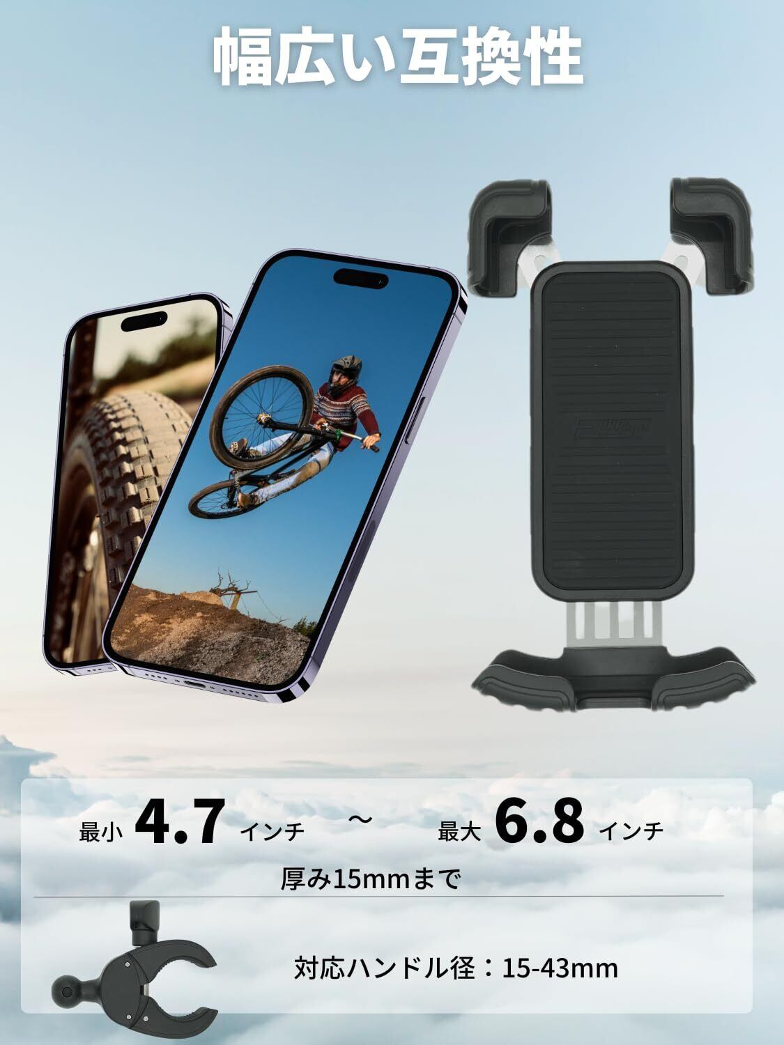 【幅広い機種&車両に対応!】 iPhone 15/14/13/12 Pro MaxやGalaxy S24/S23など、4.7〜6.8インチのスマートフォンに対応。厚さ15mmまでOK!ハンドルバーも直径15〜43mmに対応し、自転車・バイク・電動キックボード・ベビーカーなど様々なシーンで活躍!