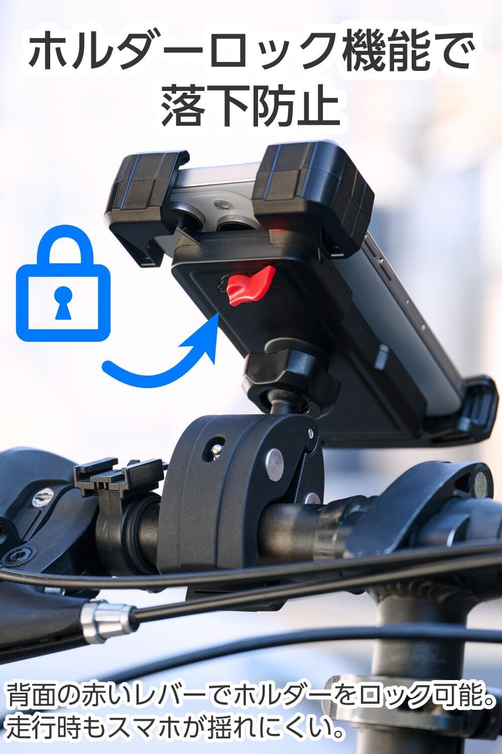 ■背面の赤いレバーでホルダーをロック可能。自転車走行時もスマートフォンが揺れにくく、落下の心配がありません。