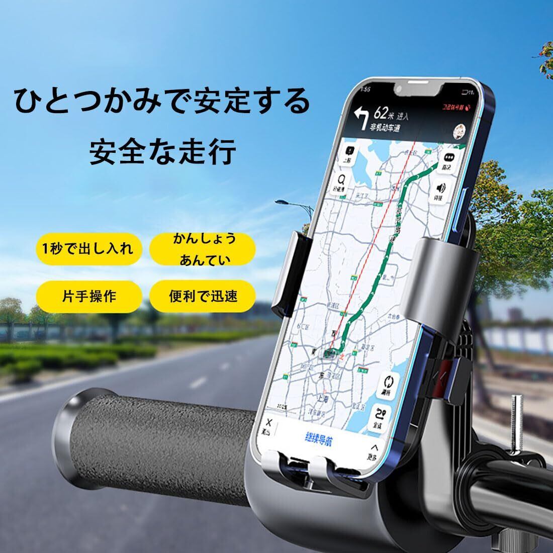【片手操作】スマートフォンでホルダーの上部を押してスマートフォンに入れ、手を離すとアームが自動的に収縮し、端末をしっかりと締め付ける。サイクリング中の撮影に便利で、また、携帯電話のグーグルマップでもナビを使いながらライドを楽しむことができます。