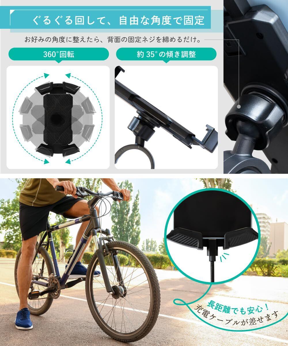 『自転車などのハンドルに取り付けるスマホホルダー』ナビや走行距離、現在時刻をパッと確認。スマートフォンをハンドルに取り付けて、ハンズフリーで。音声操作を使う方にもおすすめのスマホホルダーです。下部に充電ケーブルが差せるスペースがあり、長距離の移動も安心。