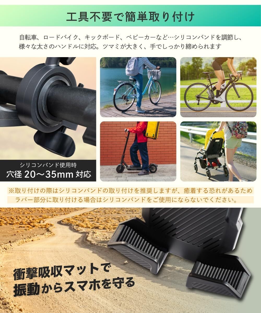 『工具不要で簡単取り付け』自転車、ロードバイク、キックボード、ベビーカーなど…シリコンバンドを調節し、穴径20〜35mmの様々な太さのハンドルに対応可能。マウントパーツのツマミが大きく、手でしっかり締められます。※穴径に合わせてシリコンバンドの枚数を変えるなどして調節してください。※シリコンバンドを2枚以上重ねて使う際は、ラバーの凸凹を合わせて使用してください。