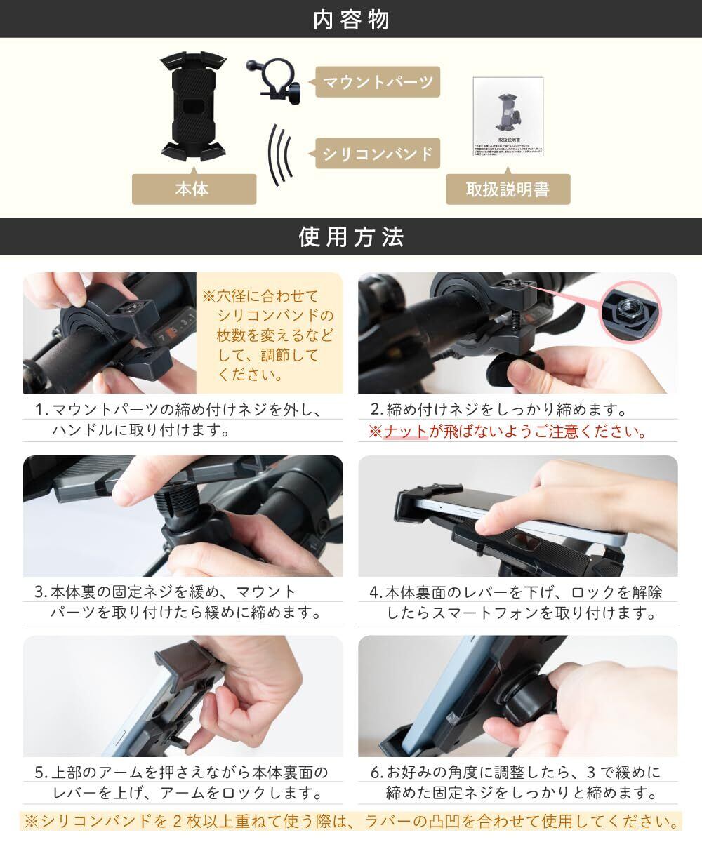 『ご注意』※走行前に、スマートフォンが固定されているか必ず確認してください。※スマートフォンおよびカバーの形状によっては、しっかりとホールドできない場合がございます。その際は使用しないでください。※取り付けの際はシリコンバンドの取り付けを推奨しますが、癒着する恐れがあるため、ラバー部分に取り付ける場合はシリコンバンドをご使用にならないでください。