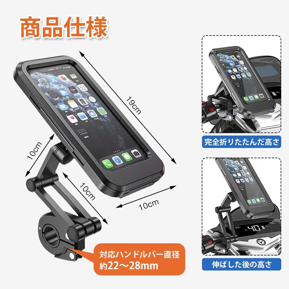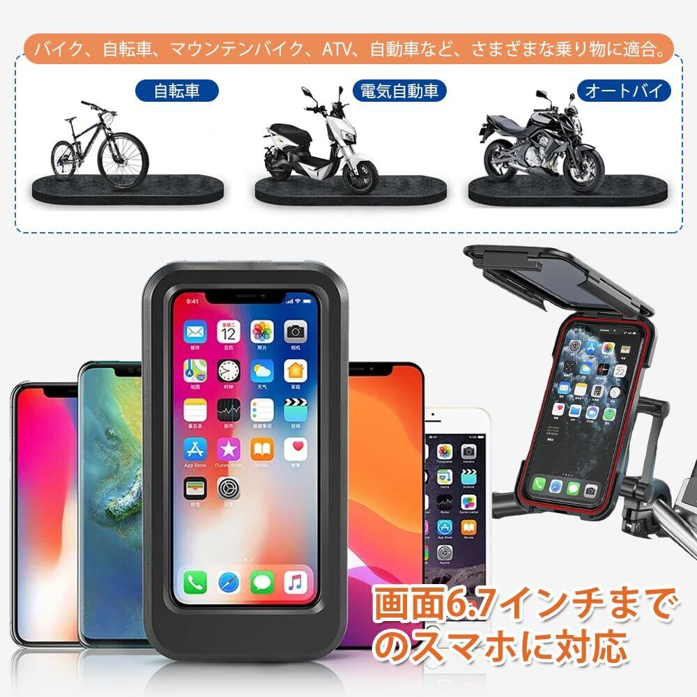 このスマホホルダーは画面サイズ最大6.7インチまで対応しており、さまざまなスマートフォンに使用可能です。完全密閉防水仕様で、雨やホコリからスマートフォンをしっかり守ります。悪天候でも安心して使用でき、スマホを完璧に保護します。防塵・防水機能がさらに安心感を提供します。