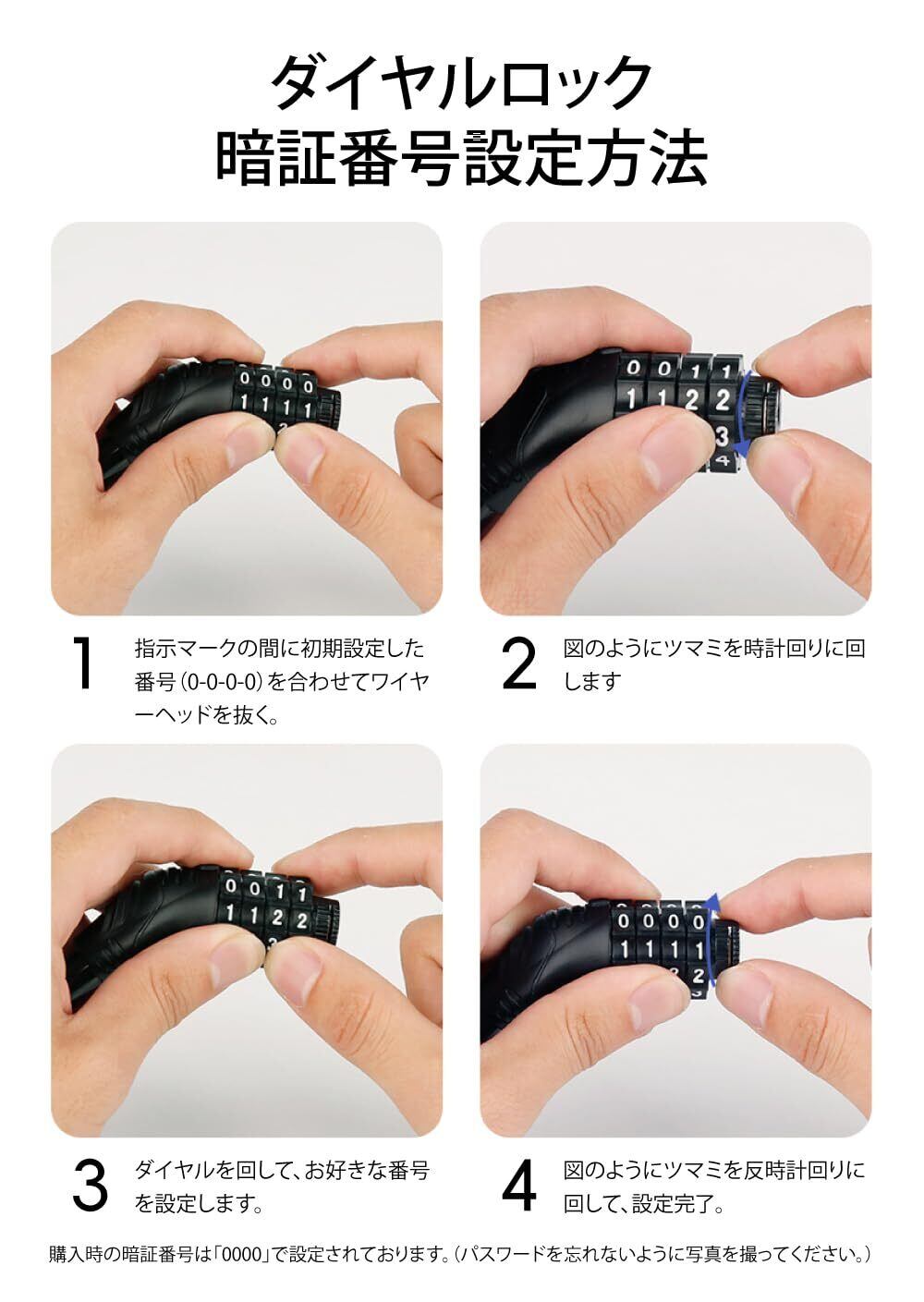 4桁ダイヤル:10000種の配列わせが可能で安全性を向上、鍵を紛失して自転車の鍵を開けることができなくなる心配がなくなり。購入時の暗証番号は「0000」で設定されております。(パスワードを忘れないように写真を撮ってください)