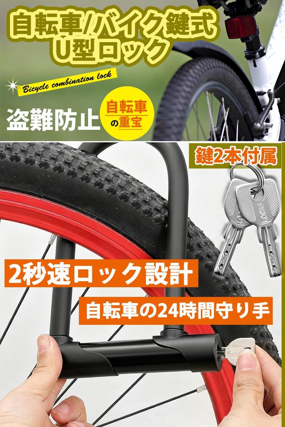 U型ロック/U字ロック 自転車 鍵 ロック 鍵式 鍵2本付属 縦200×横107mm 防錆・耐カット 防犯 高切断対抗 頑丈設計 盗難防止 屋内外対応