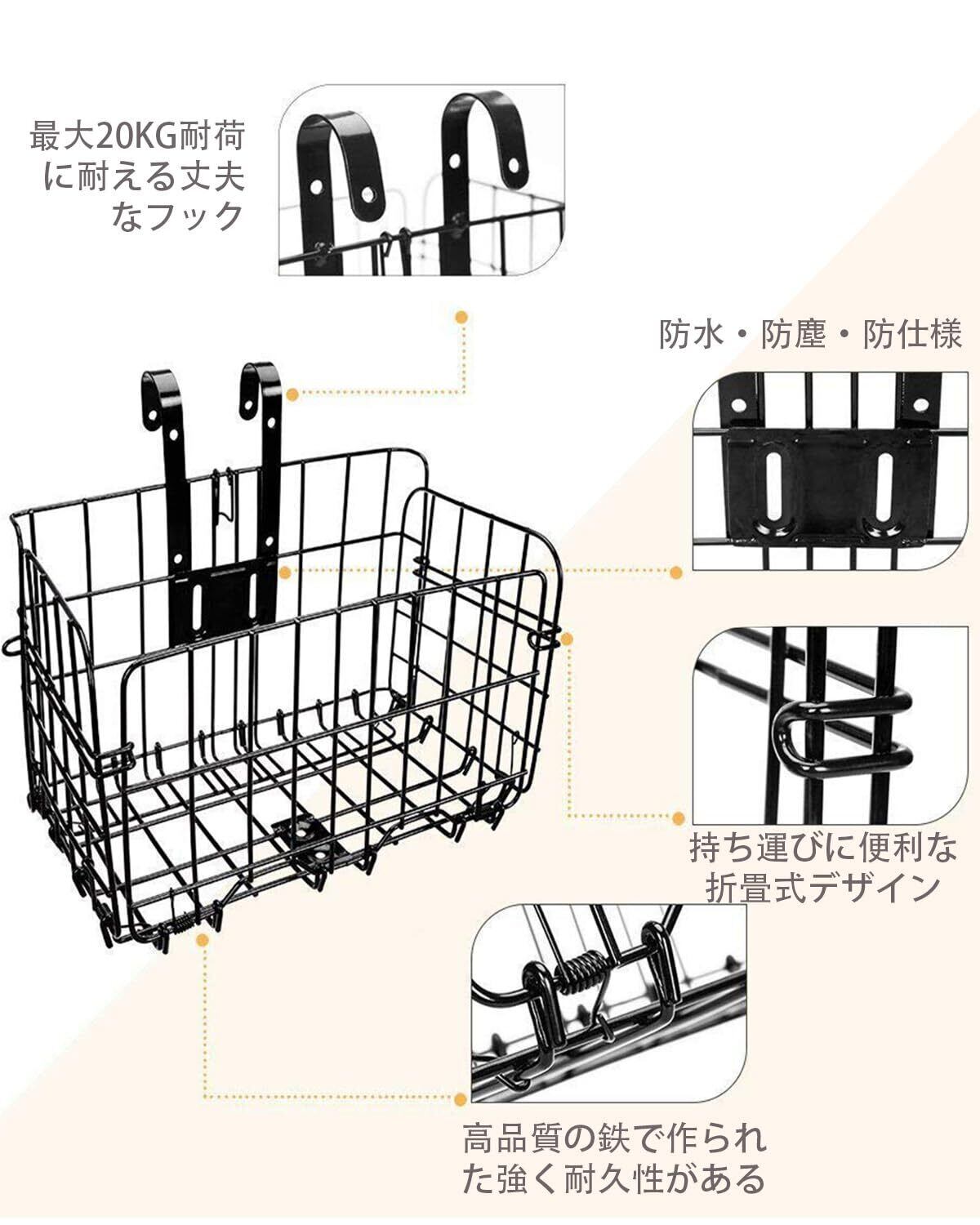 【機能詳細】折りたたみのできるカゴなので、より小さいサイズにすることができ、使わない時には収納しやすい。自転車を折りたたむ際にはカゴは取り外して折りたためば、、自転車とともにコンパクトに収納可能です。自転車のうしろカゴとまえかごにも適用です!カバンや食べ物や生花やペットなどを入れられます。耐荷重:20KG。
