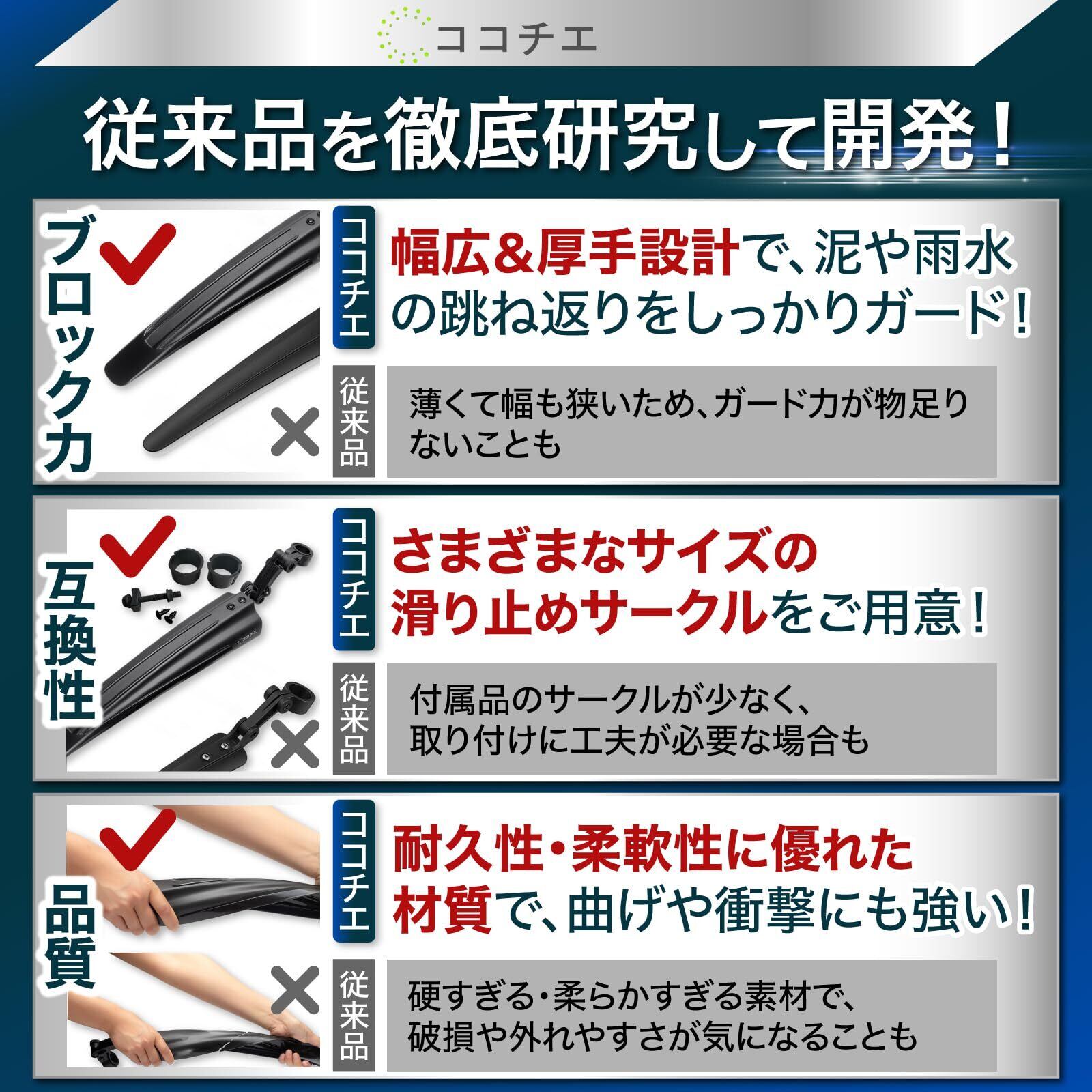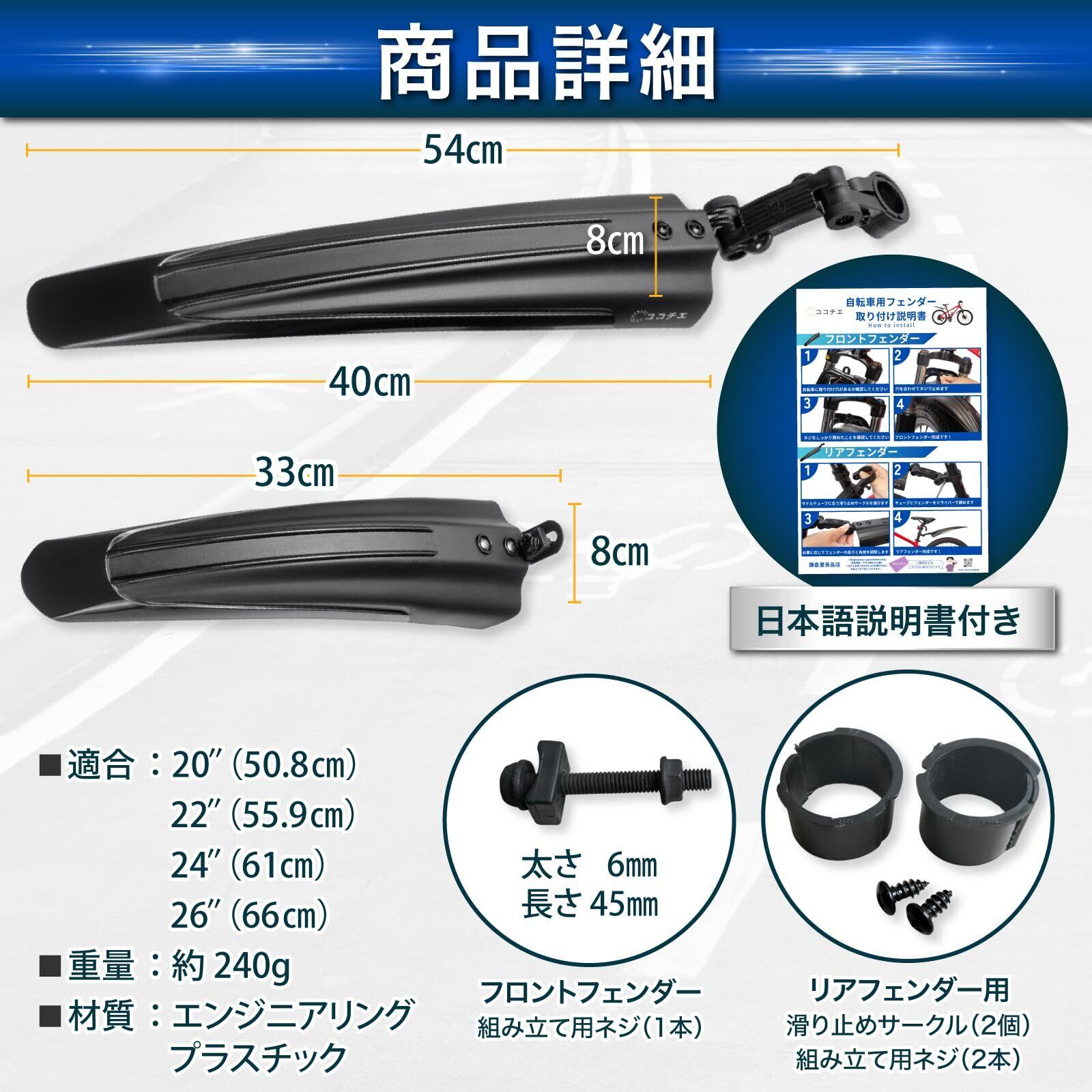【互換性が高い!】当社の自転車用フェンダーは、20〜26インチに対応しており、マウンテンバイク・ロードバイク・シティバイクなど、さまざまなタイプの自転車に適合しています。
