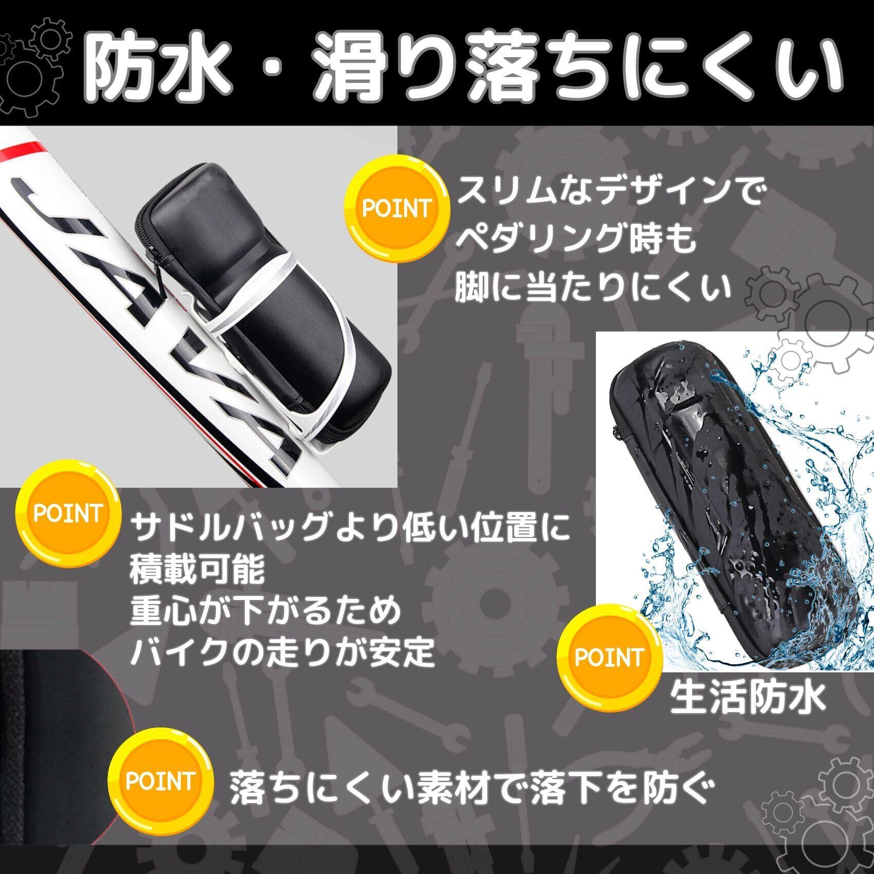 落ちにくい素材で落下を防ぐ 柔軟性があり、衝撃に優れたEVA素材を使用 ボトルゲージから滑りにくいように、摩擦を高める素材を使用し落下を防ぎます 邪魔にならない! 耐久性に優れ、軽量 スリムなデザインでペダリング時も脚に当たりにくい。 抜群の固定感で、安定性がより良い。 重量はわずか100g弱。 小サイズ 約73g 大サイズ 約96g 注意:車体、身長などの差異があるので、膝に当たる可能性もあります。 7)・サドルバッグより低い位置に積載可能 重心が下がるためバイクの走りが安定します