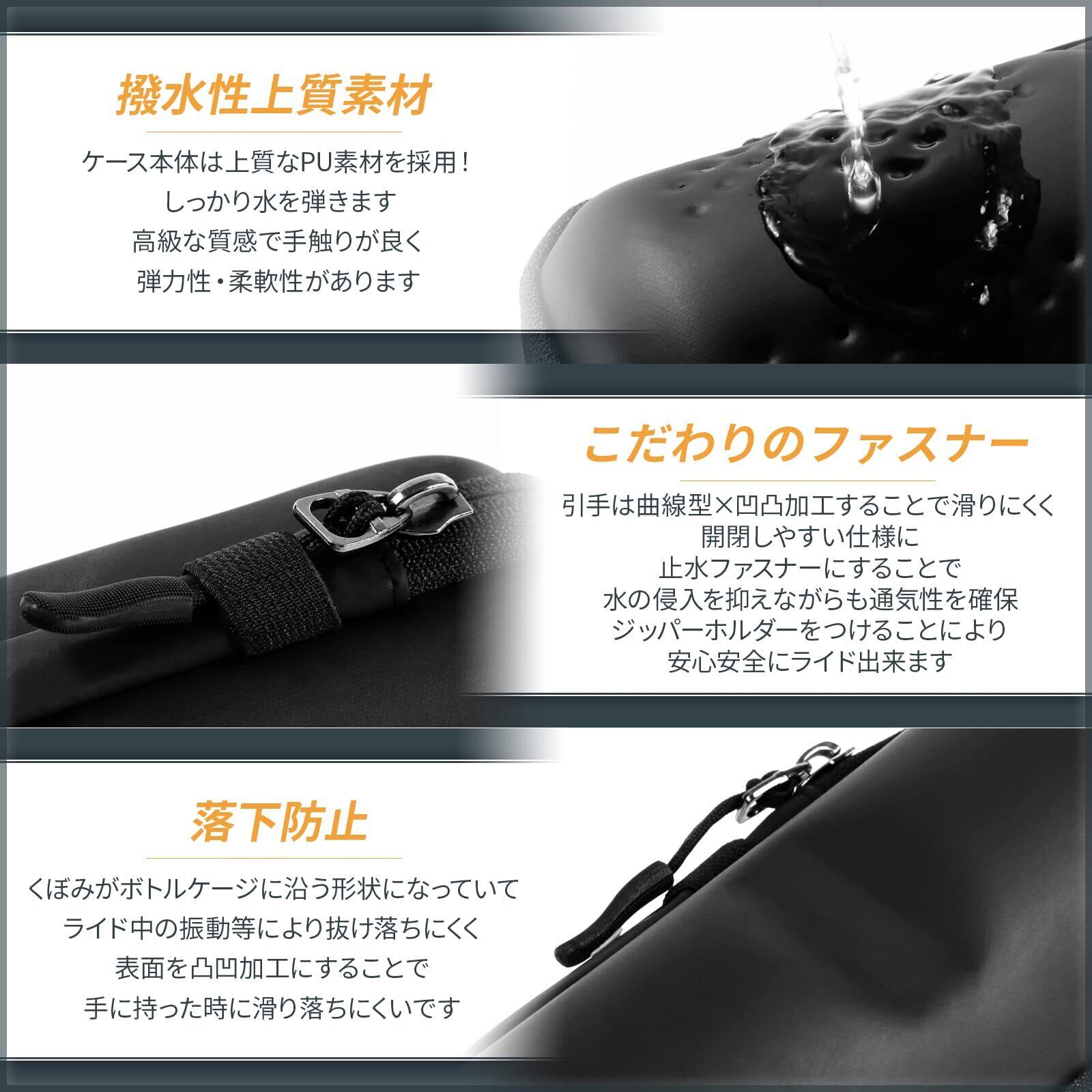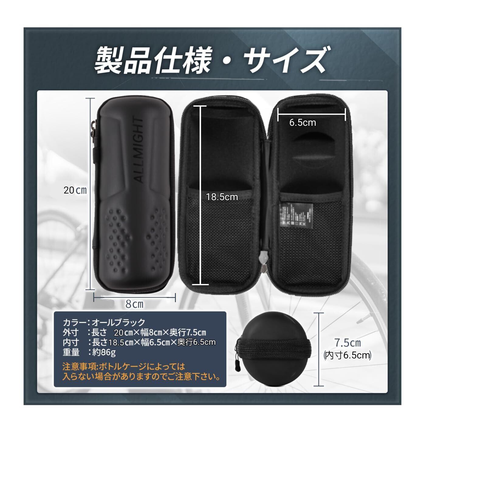 【 最軽量×観音開き×大容量 】重量約89gで軽量化することで最軽量なのに必要最低限の荷物が入るから、自転車、ロードバイクで身軽にサイクリングが出来て、十分にたっぷり収納出来るツールボトル。 観音開き仕様で取り出しやすくすることで利便性UP。 【 ファスナーへのこだわり 】引手は掴みやすい曲線型で表面は滑りにくい凹凸加工なので扱いやすい仕様に、ツールボトルの防水素材に加えファスナーは水の入りにくい止水ファスナーを採用、水の侵入を抑えながらも通気性を確保することに成功しました。 ファスナー止めが付いていてライド中もバタつかなくて余計な音もしないので安心。 止水ファスナーを採用していますのでファスナーの開閉はかためです。 【 材質へのこだわり 】材質が良く高級な質感で手触りが良く・弾力性・柔軟性があります。 ツールボトル本体は特殊素材を採用し撥水加工にすることで水をはじき、プラスチック製の物とは違いソフトタイプなので自転車、ロードバイクで走行中の音鳴りを防ぎます。 【 ツールボトル本体へのこだわり 】全ての自転車、ロードバイクに馴染むオールブラック。 ツールボトル本体の窪みがボトルケージに引っ掛かり抜け落ちにくいかたちになっています。 使用しているボトルケージのサイズとツールボトルのサイズが合わず、入らない可能性がございますので要ご確認の上ご購入下さい。 ※使用しているボトルケージのサイズとツールボトルのサイズが合わず、入らない可能性がございますので要ご確認の上ご購入下さい。