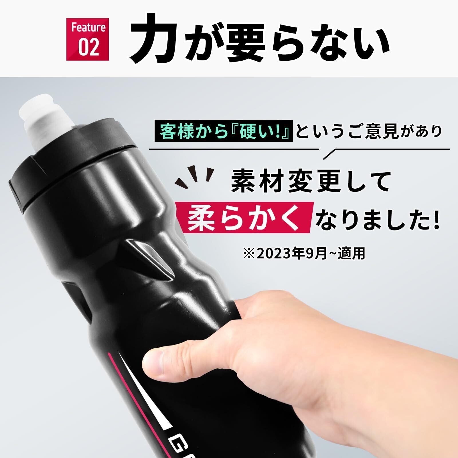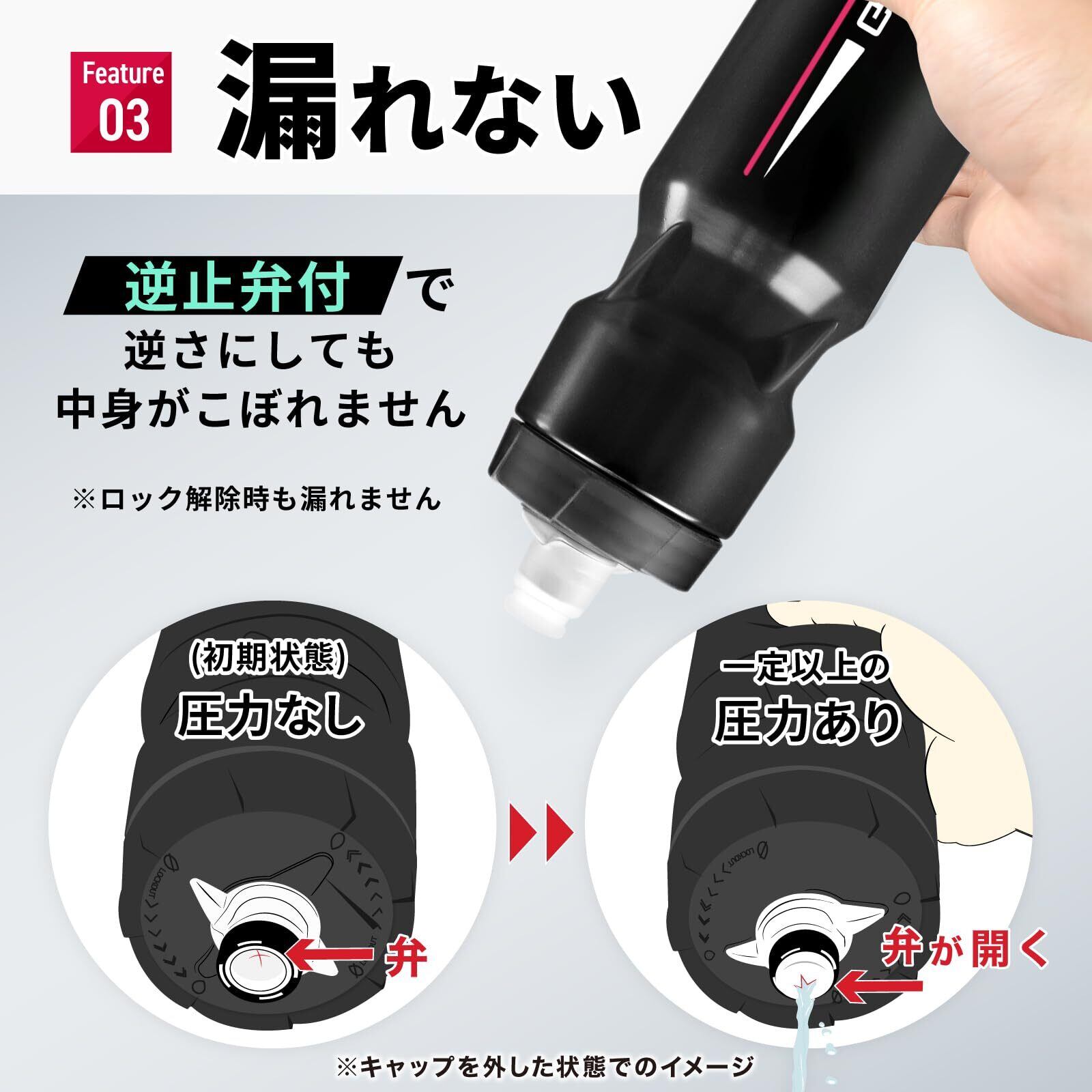 【握るだけの簡単操作】このドリンクボトルは握るだけで簡単に水が出るジェットバルブ式です。ロックを解除しておけば、走行中でもスムーズに水分補給ができ、衛生的な設計となっています。柔らかい素材で作られているため、疲れていても楽に使えるスポーツボトルです。さらに、ボトルを逆さにしても漏れないため、安心して使えます。