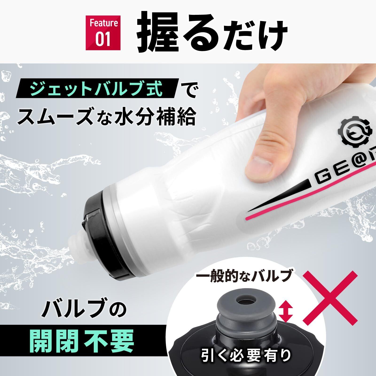 【ジェットバルブ】自転車用ボトルには、握るだけで水が出るジェットバルブ式を採用しています。走行に集中しながらでも、口を付けずに簡単に水分補給が可能で衛生的です。さらに、この機能によりスポーツボトルとしての利便性も高まっています。