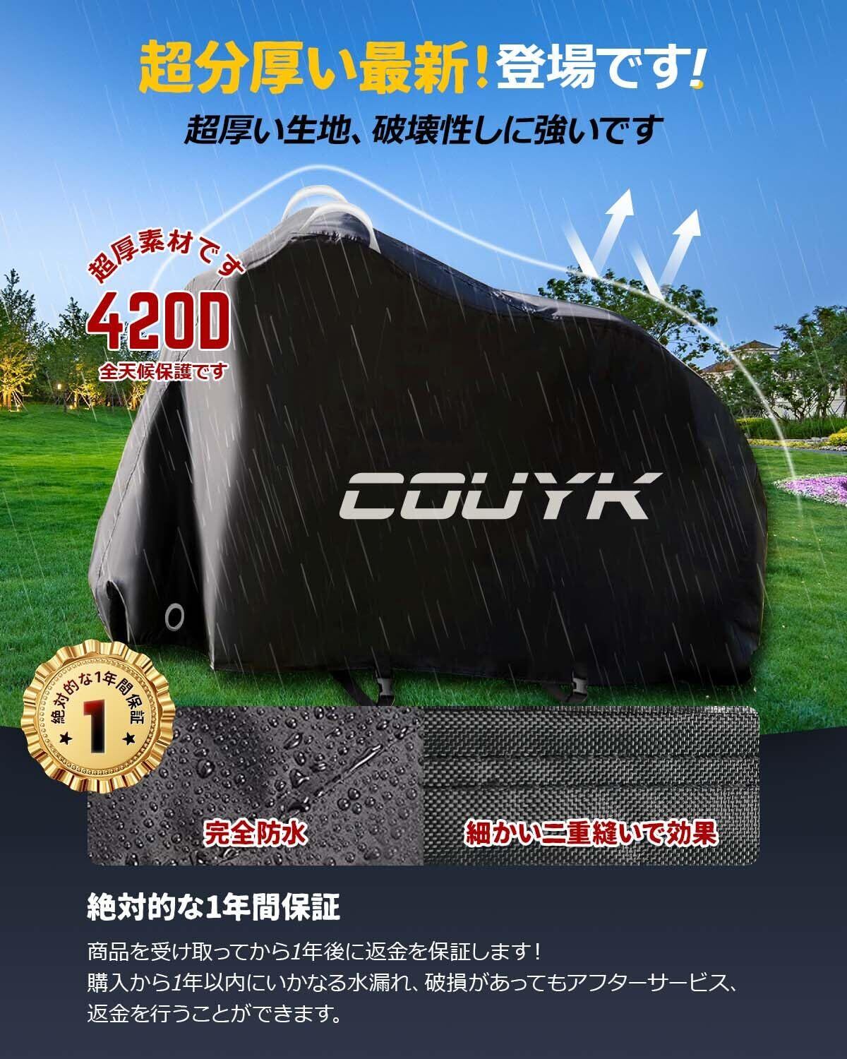 【超長持ち耐久使用的な生地】COUYK自転車のカバーは420D高密度オックスフォード生地の精密な二本針二重環縫いミシンを採用して、より厚くて丈夫で、破れにくくて、耐久性があります。COUYK自転車のカバーは、210Dとより薄い生地に比べて、風、霜、雨、雪の被害によく耐えられます!!