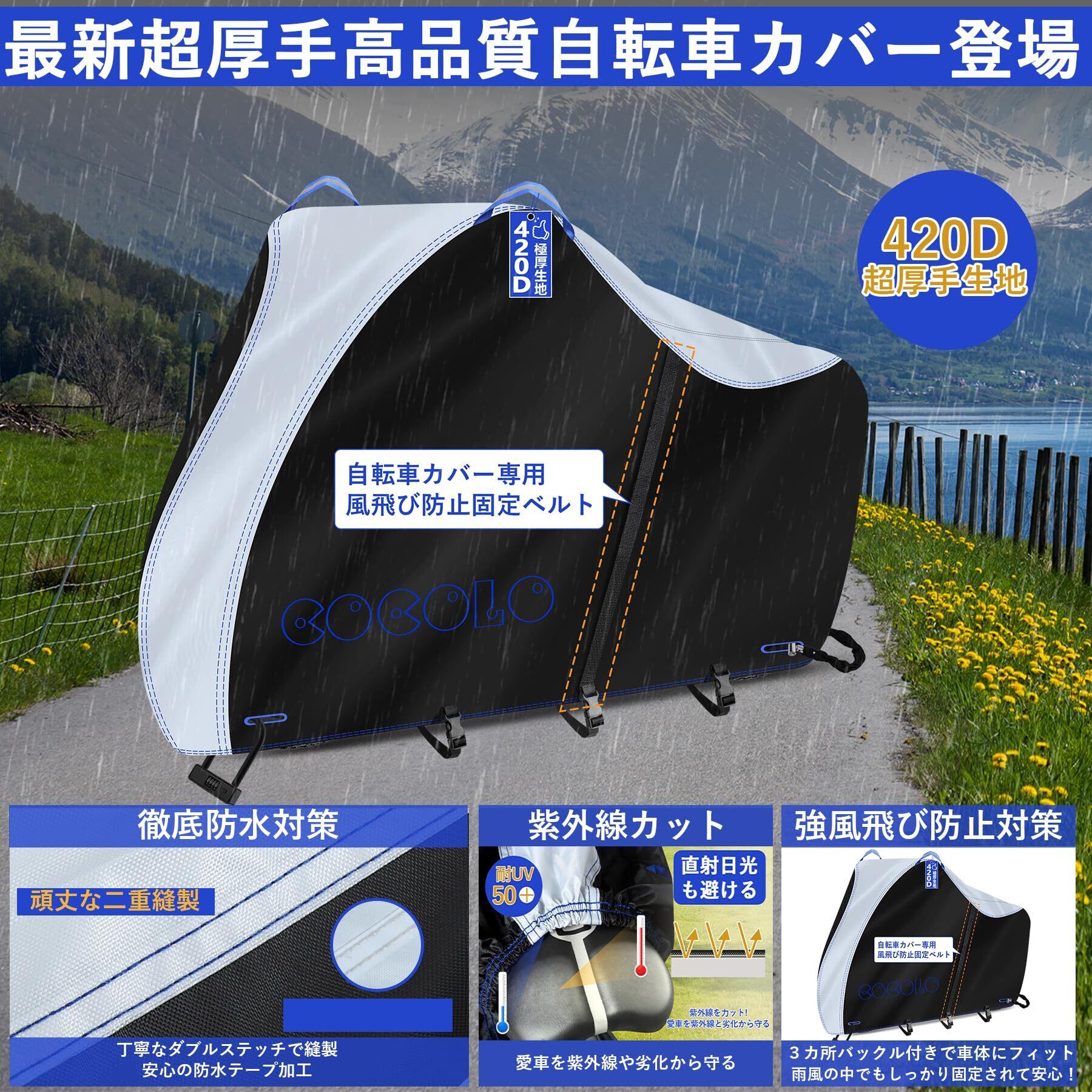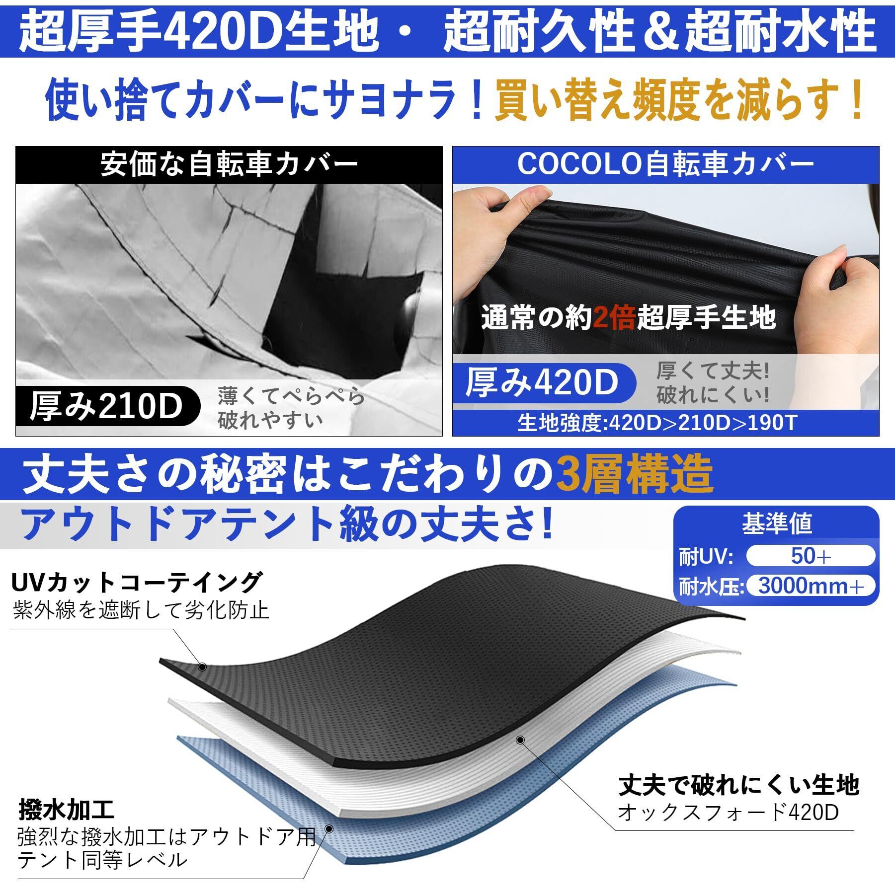 【超厚手420D生地&破れにくい】 自転車カバーは、高性能で超厚手の420Dオックスフォード生地を使用しています。一般的な薄くて破れやすい自転車カバーと比べて、丈夫で破れにくいのが特徴です。ほどよい重さがあるため、持ち運びや取り付けも簡単です。また、使い捨てと買い替えの頻度が減るので経済的です。