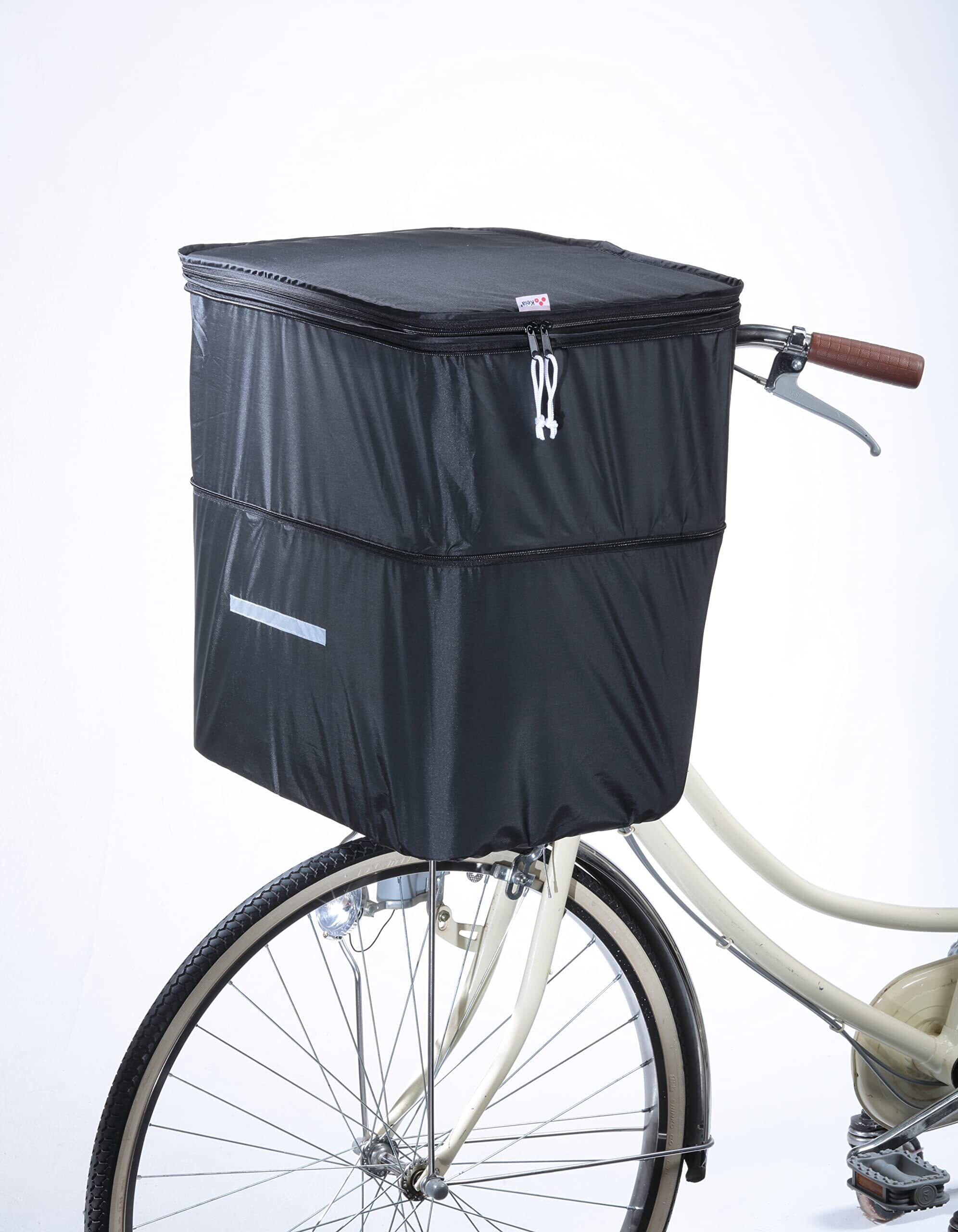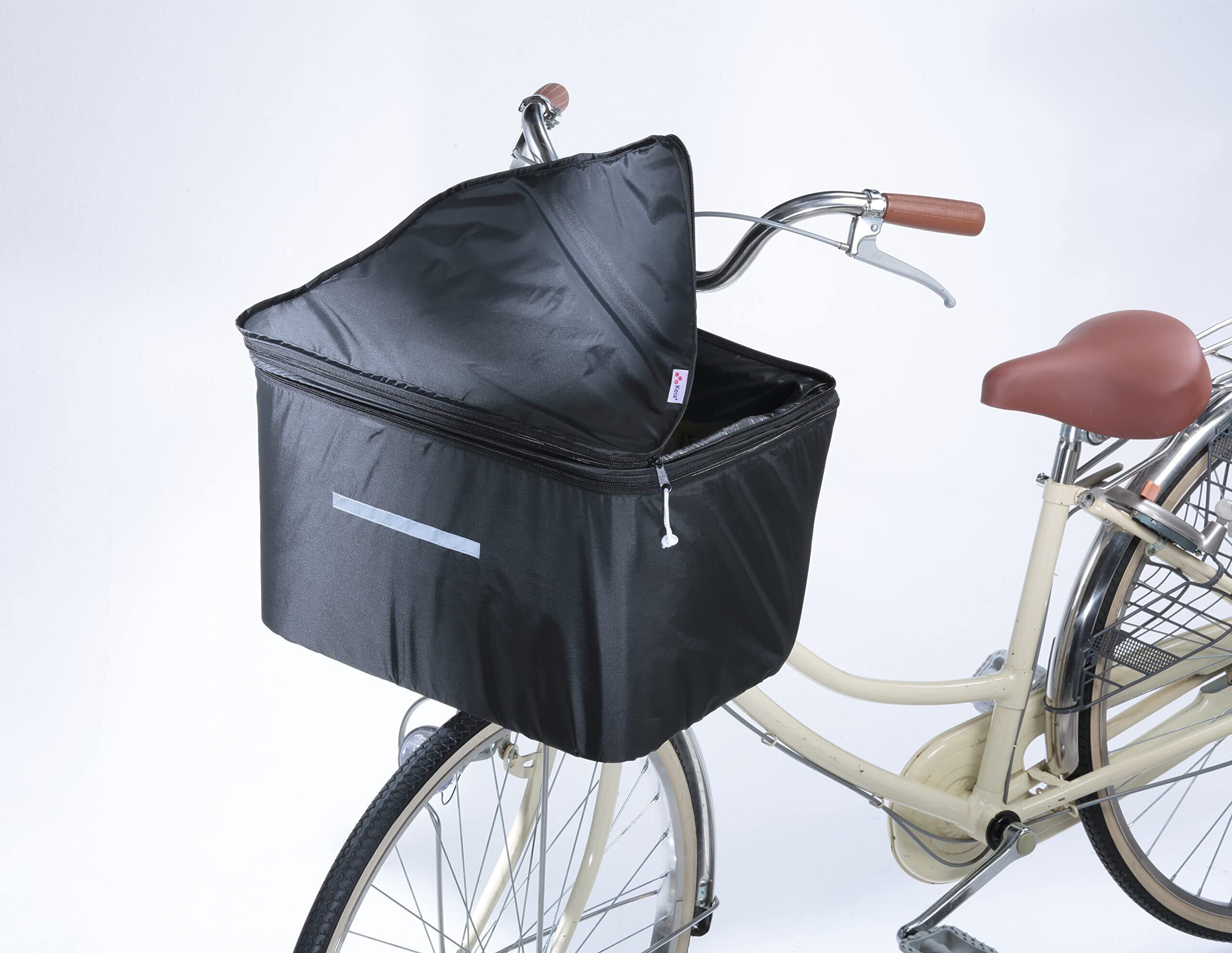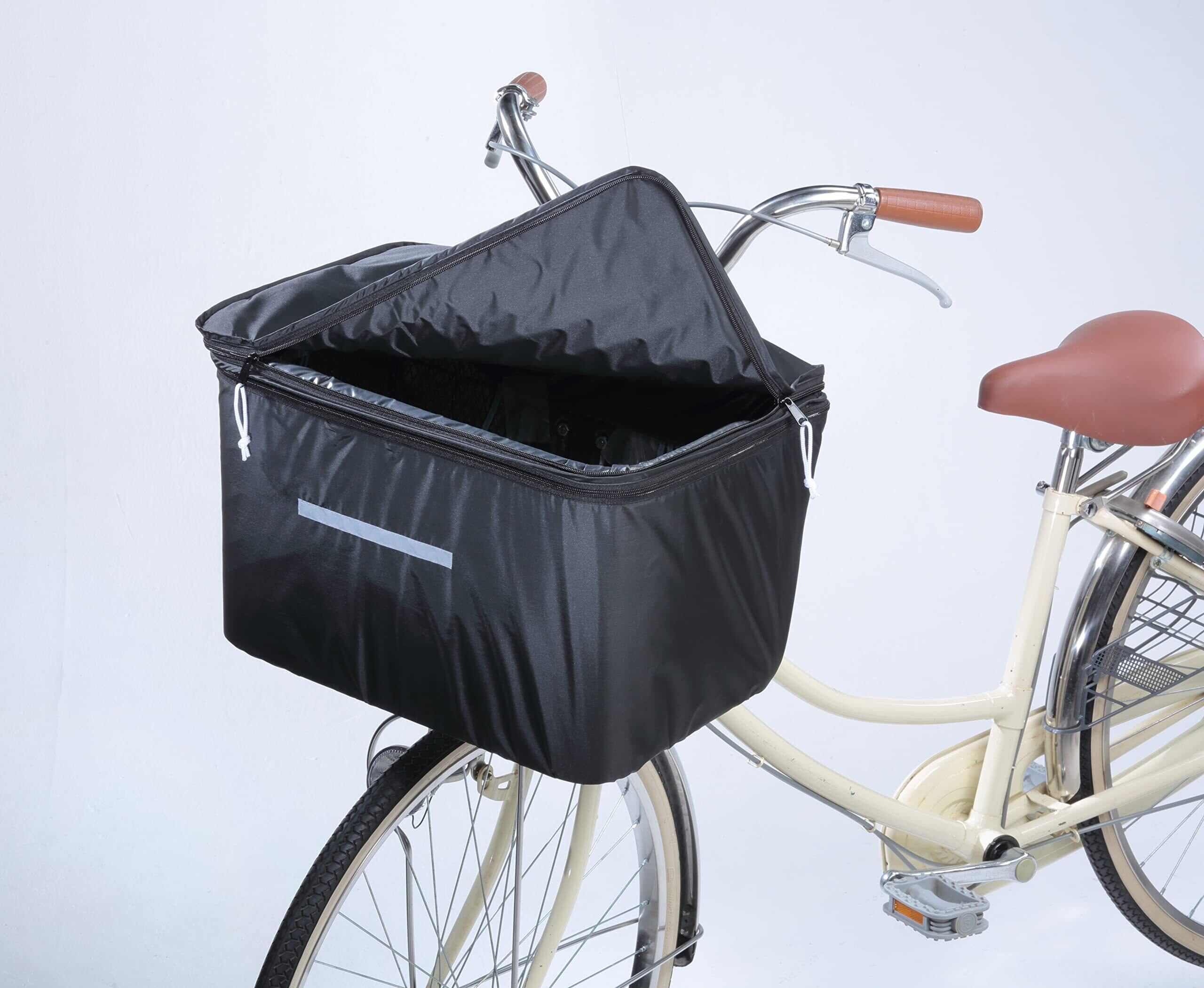 本体・ファスナーの色もオールブラックで、男性にもご利用いただけるシンプルなデザイン。 夜道も安心の反射帯付き。 たっぷり収納できる2段式カゴカバー。 雨の日も安心な防水&撥水加工。 両開きで開閉楽々。 背面伸縮ゴム入り。