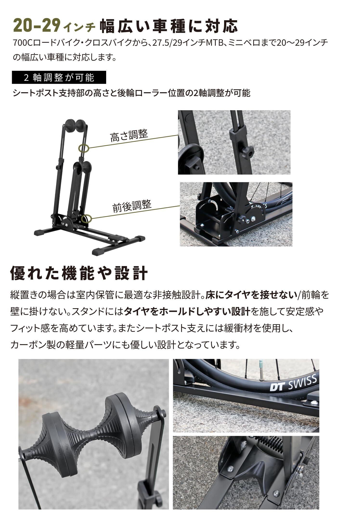 【付属品】前輪固定用ストラップ/工具レンチ/日本語説明書 【材質】スチール(粉体塗装仕上げ・防錆性)ナイロン(ベルクロ) 【組立寸法】幅40cm × 奥行56.5cm × 高さ55~84cm 【折りたたみ寸法】幅40cm × 奥行64cm × 高さ12cm 【製品重量】約5kg 【耐荷重】最大20kg 【対応自転車】20~29インチ MTB・700C ロードバイク 【対応タイヤ幅】最大60mm【使用上の注意】 ・耐荷重(20kg)を超える車体には使用しないこと ・電動アシスト自転車、リアキャリア搭載自転車、荷物を積載した状態の車体には使用不可 ・縦置き時は必ずベルクロストラップで前輪をフレームに固定すること ・自転車を載せたままスタンドを移動しないこと ・屋外や不安定な床面での使用不可 ・カーボンフレームや特殊形状フレームでは事前確認を推奨
