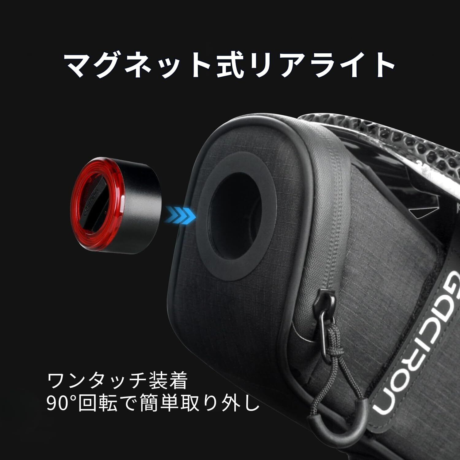 【マグネット式ワンタッチ着脱】 リアライトは90°回転で簡単取り外し。充電や持ち運びもスムーズ。