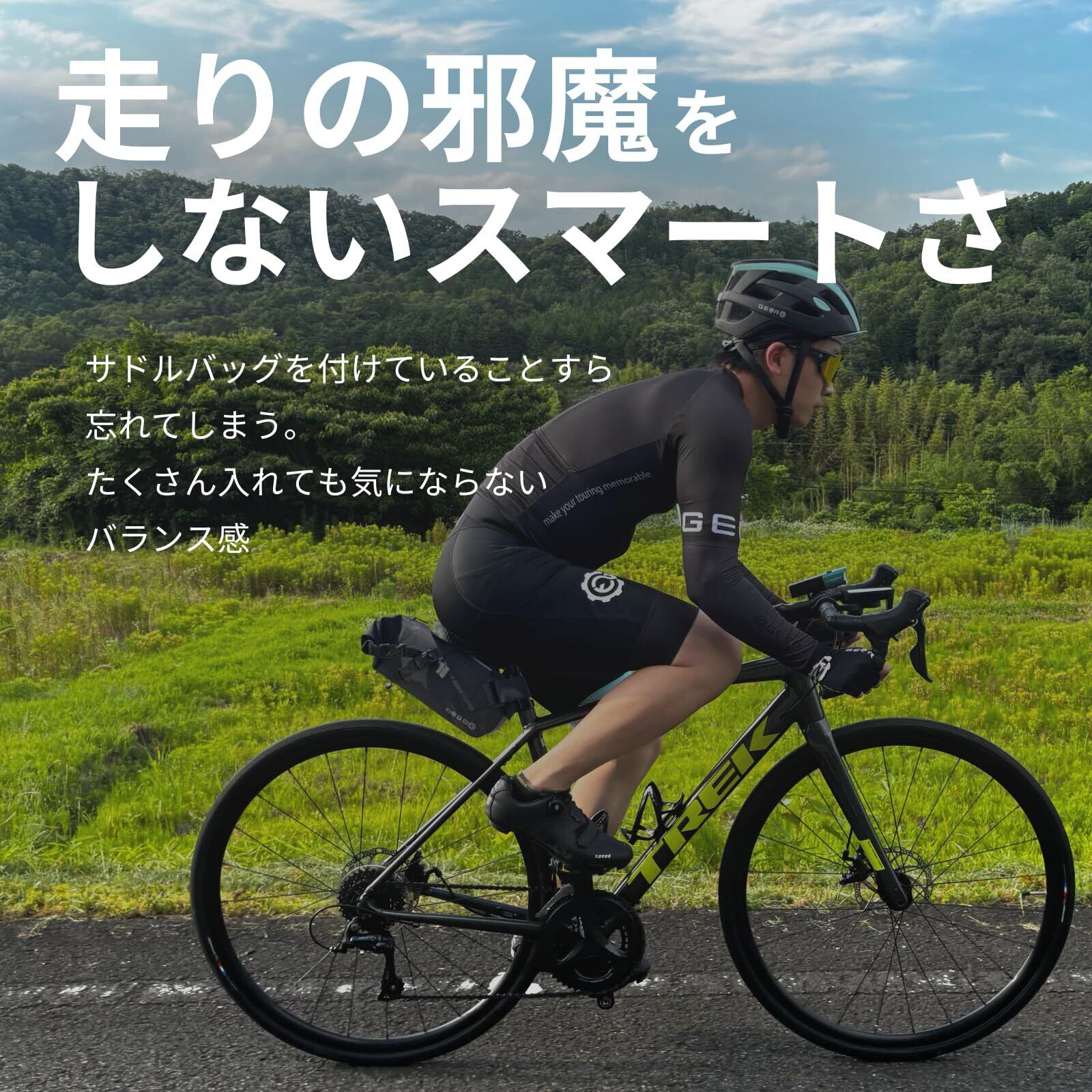 【ライドスタイル】ギアトルのサドルバッグは、1泊2日のロングライドに最適なサイズの自転車用バッグです。従来のサドルバッグは、ロードバイクやクロスバイクでの長距離ライドには大きすぎて横揺れがひどく、使いづらいという悩みがありました。しかし、このサドルバッグはその常識を覆し、コンパクトに見えて大容量を実現し、長距離ライド中も邪魔にならないよう設計されています。さらに、このサドルバッグはトップチューブバッグやフロントバッグに入りきらない小物類も収納可能です。サドルバッグに入れることで、新しいライドスタイルを楽しむことができます。
