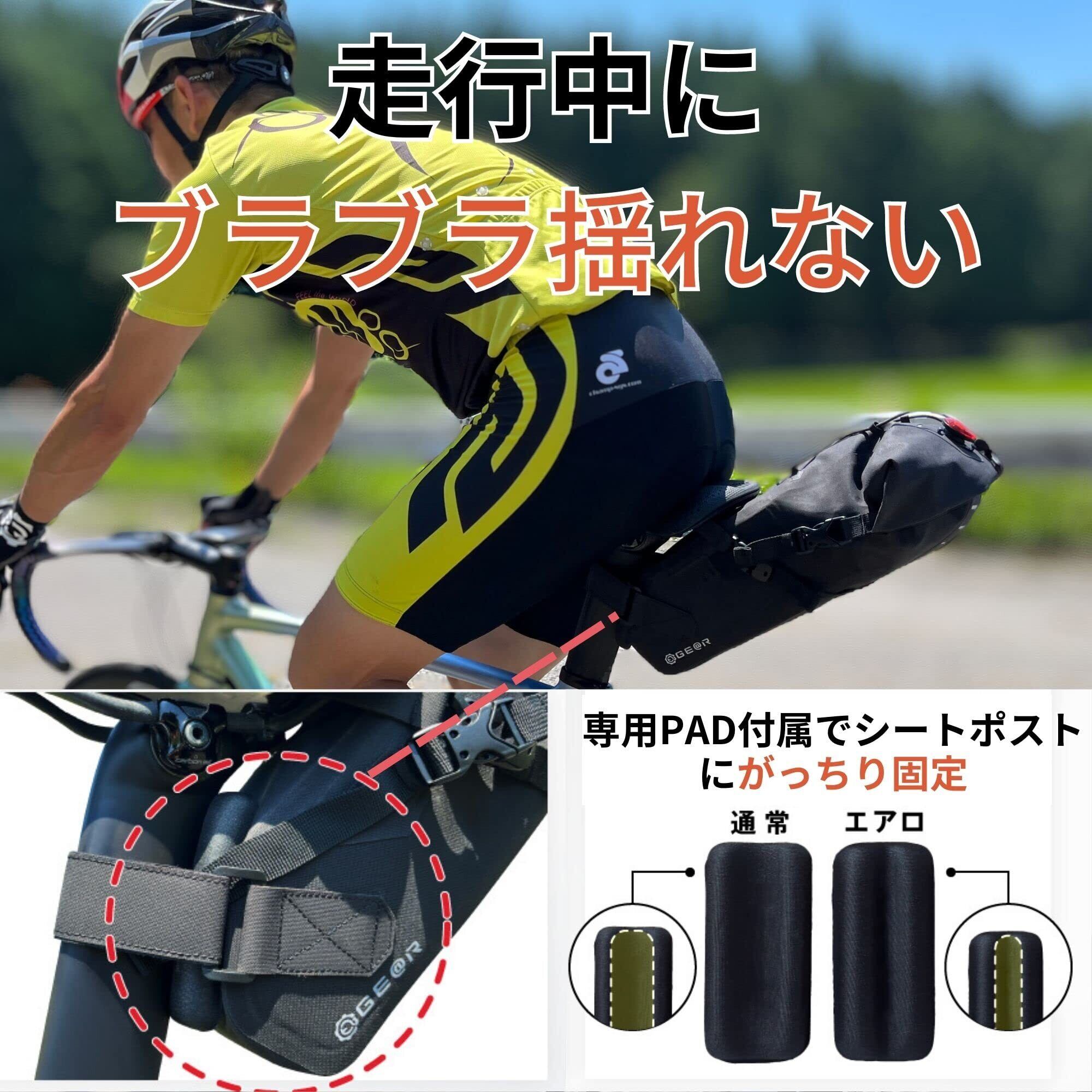 【横揺れ防止】このサドルバッグには専用PADが付属しており、サイズが大きくなると気になる横揺れを防止します。PADをシートポストとの間に挟むことで、車体との固定力が上がり、走行中もブラブラせず、快適な走行が可能です。エアロタイプ、ノーマルタイプのどちらの自転車にも対応できるよう、2種類のPADが付属しています。