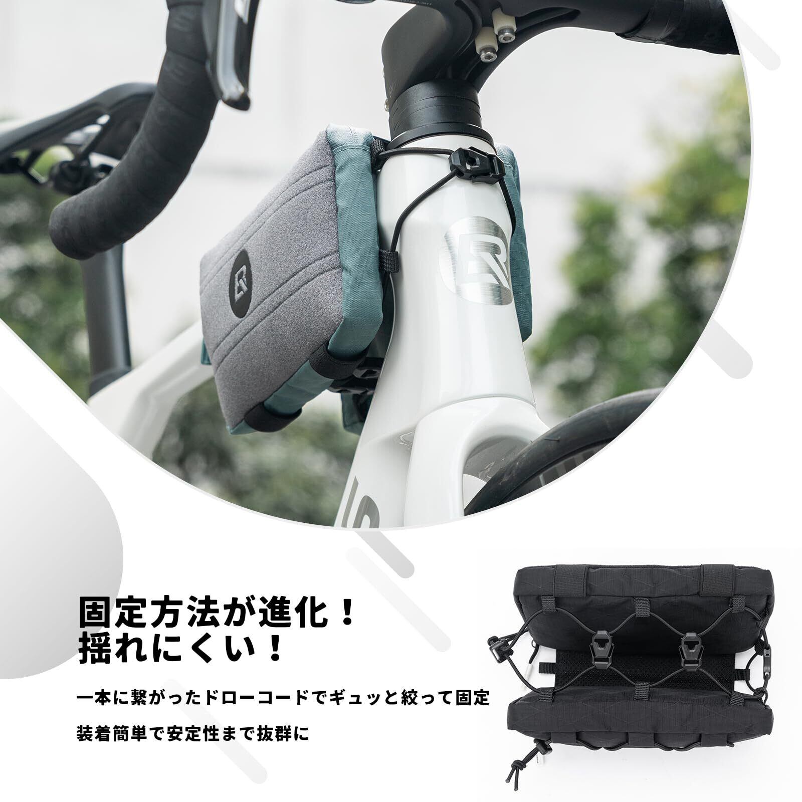 【簡単に装着】自転車バッグはドローコードシステムを採用しており、車体へのフィット感が向上し、安定した装着が可能です。安定してしっかり固定できることで走行中の揺れを最小限に抑えます。コード式でベルクロが余る心配がなく、スッキリとしたスタイルを実現しました。