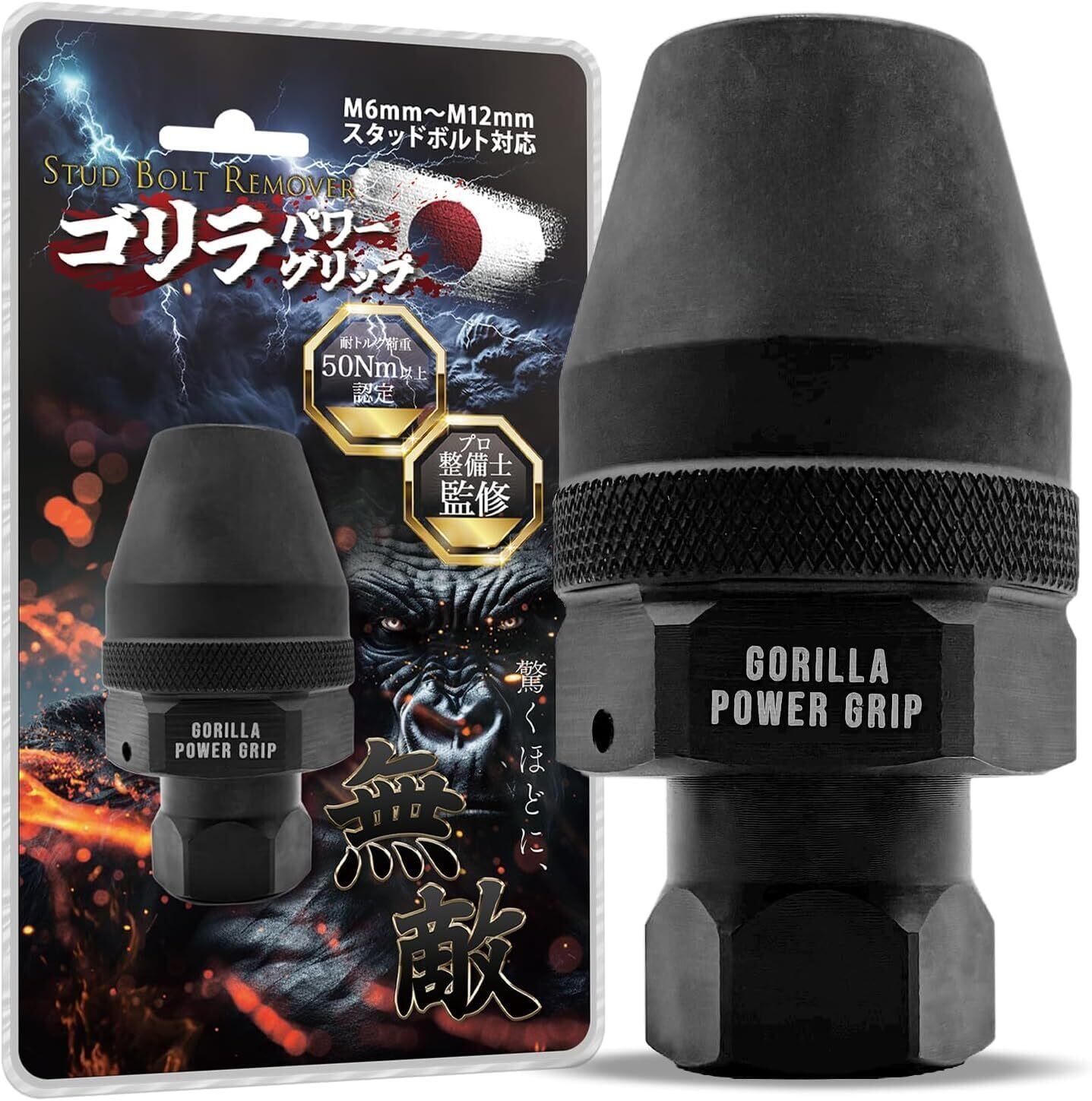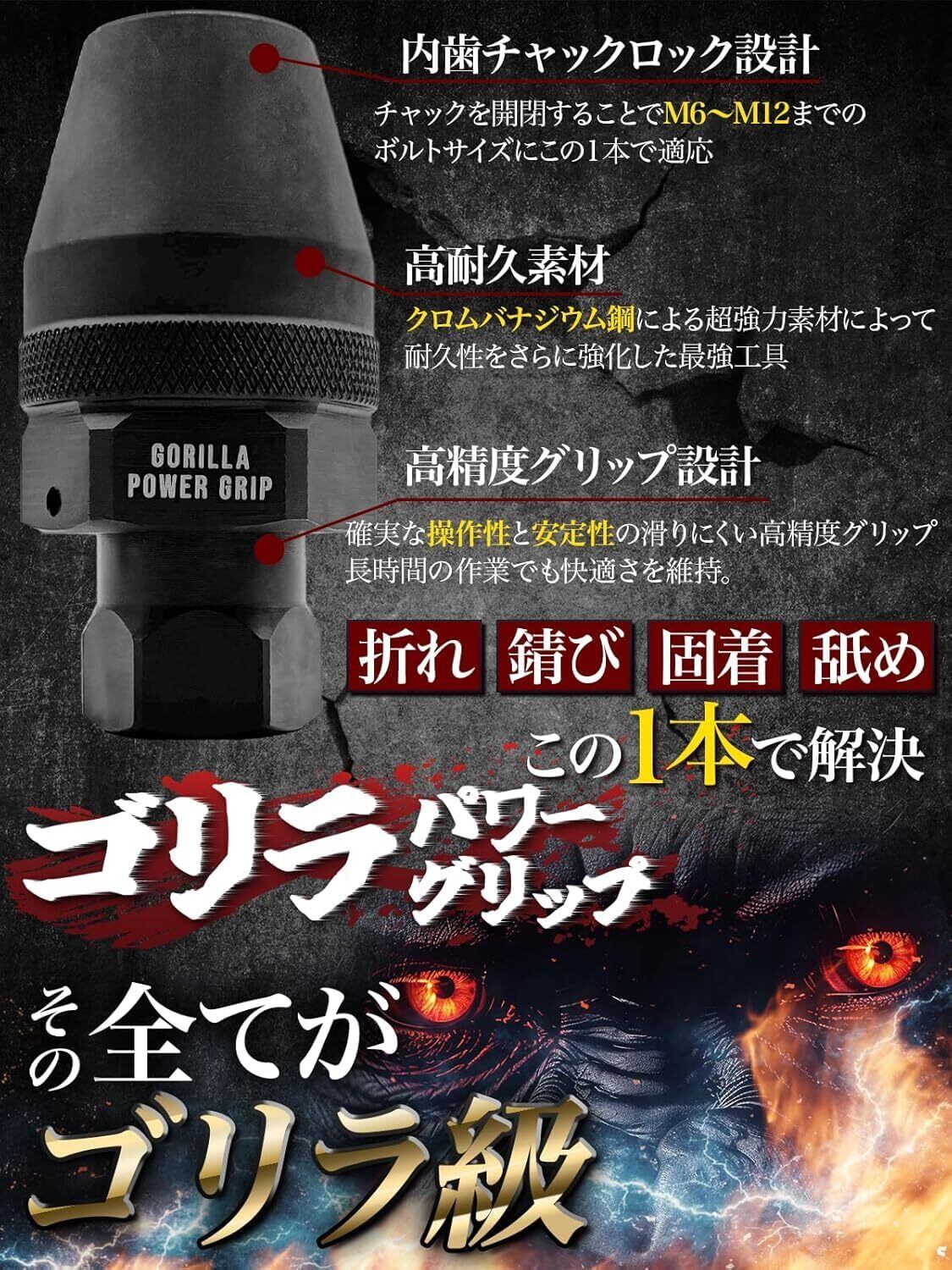 【ゴリラパワーグリップの詳細】 折れ/固着/錆び/舐めたたスタッドボルトを取り外すためのツールです。 ■対応サイズ:M6〜M12(6mm〜12mm) ■対応工具:3/8インチドライブ対応。1/4インチ〜1/2インチドライブのインパクトレンチ・ラチェット・モンキーレンチ・フラットレンチで使用できます。