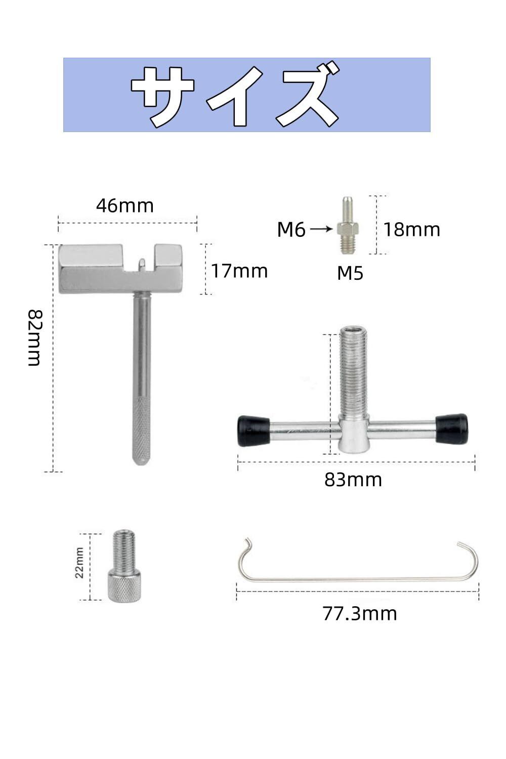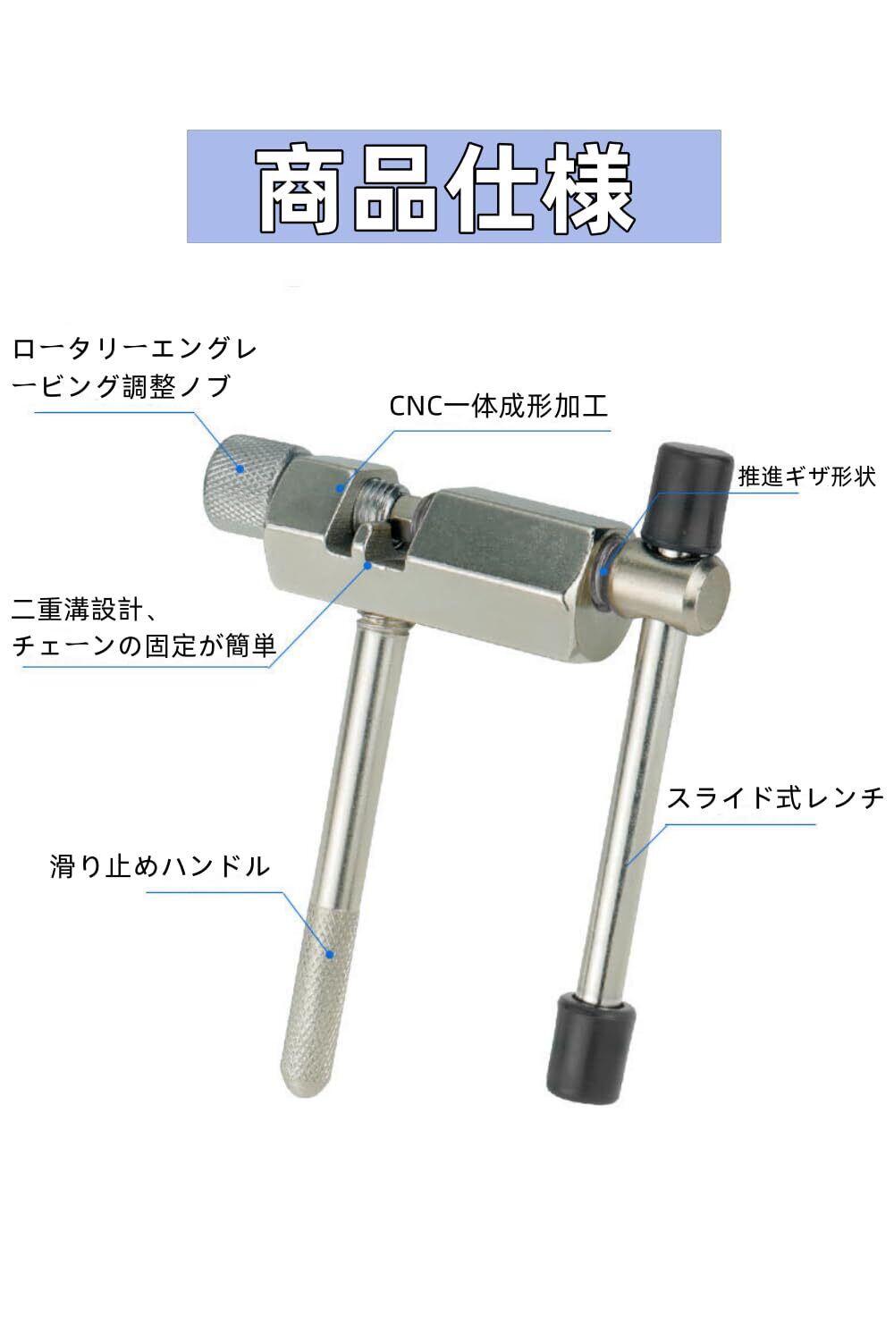【セット内容】チェーン修復工具5点キットです。チェーンカッター×1、イジェクターピン×2、チェーンフック×2。【適用】自転車チェーンカッターは6速から12速、シングルスピードチェーンを含む様々な自転車チェーンに対応。チェーンピンの取り外し・取り付けが簡単に行えます。